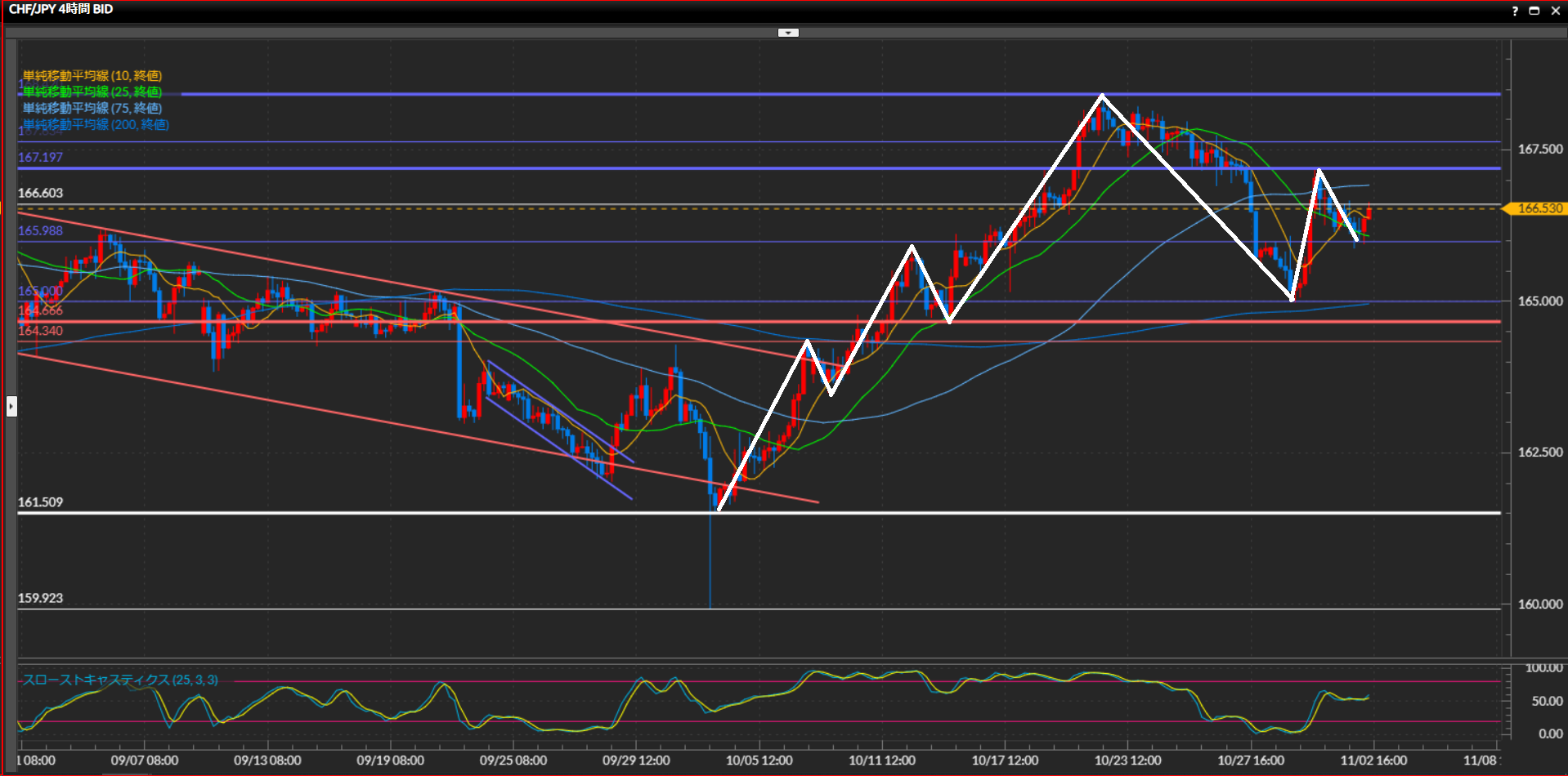 高値を切り下げたため、下目線に転換。ただし10SMAが下に折れ曲がっており、こういう時は経験上テクニカルが機能しにくくなるため若干警戒。直近の波の高値は167.20円で、切り上げたら再び上目線。