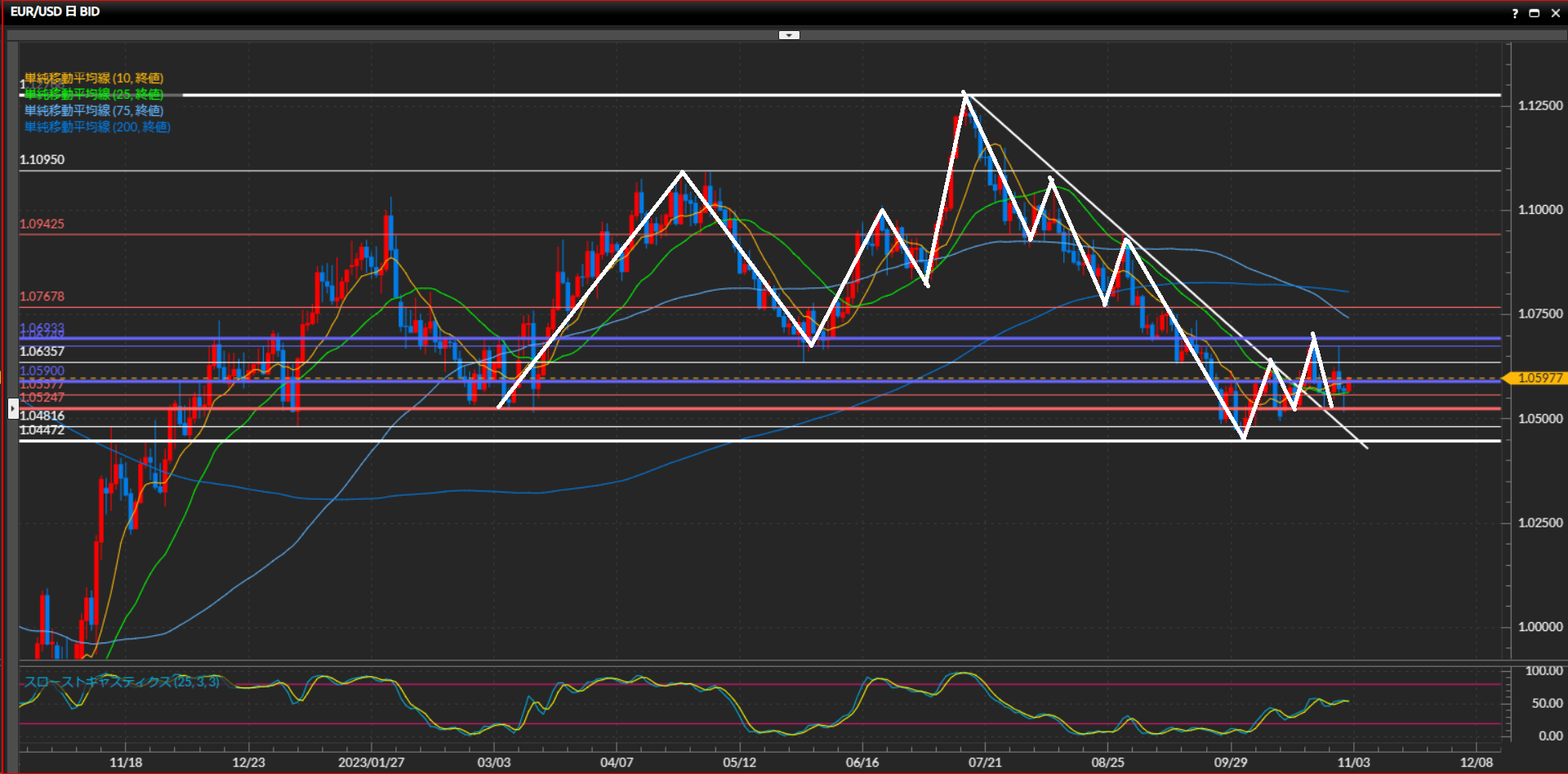 小さな波では高値安値切上げの上昇トレンド。日足の下降トレンドラインをブレイクし上目線に切り替わったが、売りの勢力もまだ強い。SMAは10SMAの傾きが弱く、ローソクは25SMA付近で停滞中。