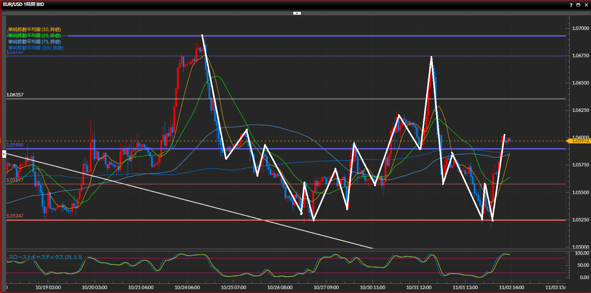 波が高値を更新出来なかったため、1.0525ドル〜1.0693ドルのレンジ相場へ突入と捉える。足元は下値の水平線でサポートされ、上昇局面。
