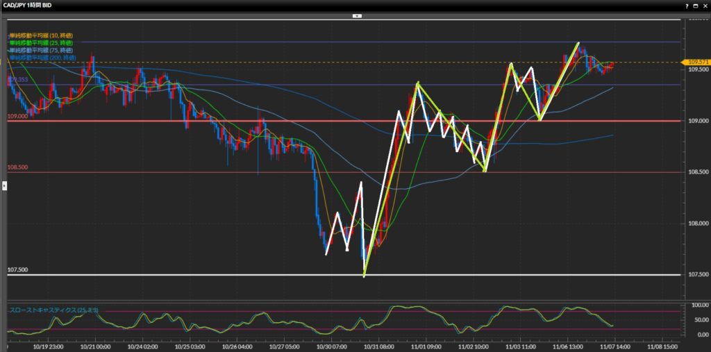 逆に白色の波が下目線に転換したら、上昇の起点107.50円までを目標にショート。