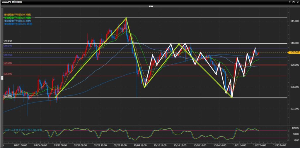波の高値で引いた水平線109.99円でレジスタンスされたら、レンジへ突入。