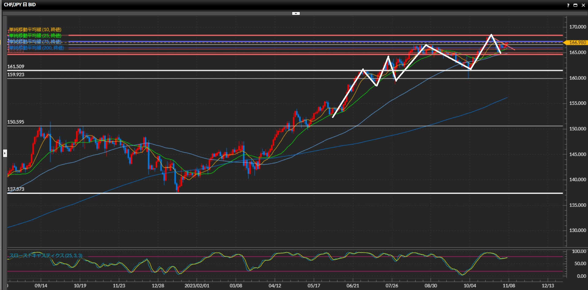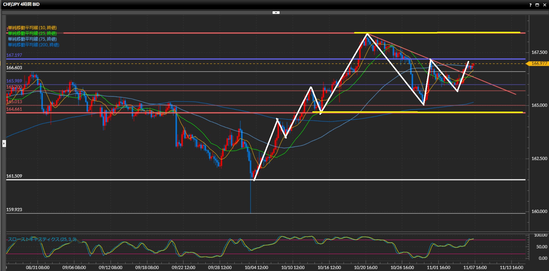 10月20日に最高値168.42円をつけた後下落した後、次の波では安値切上げ高値切下げ。