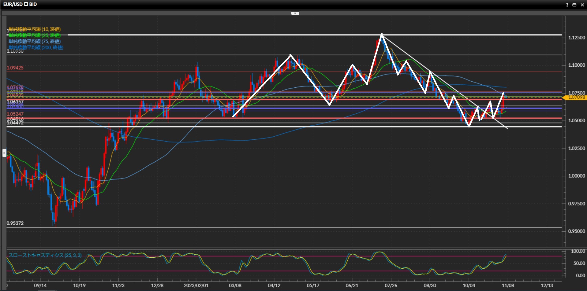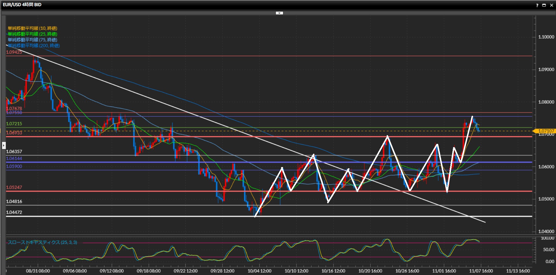 下値は4時間足水平線1.0693ドルが通っており、サポートとして機能するか注目。