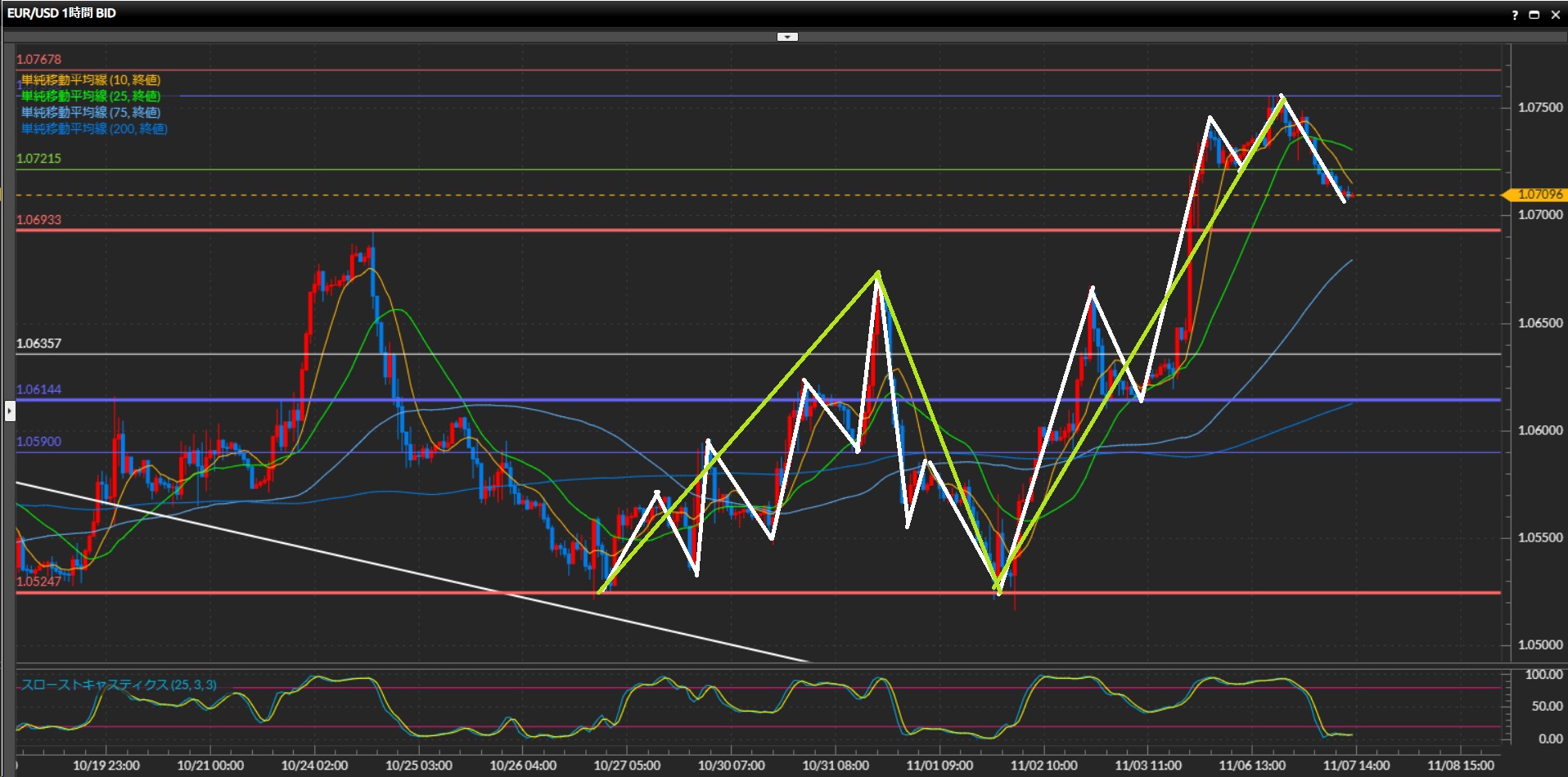 逆に白色の波が下目線に転換したら、上昇の起点107.50円までを目標にショート。