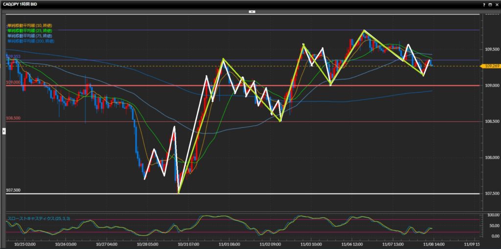 ただし大きな波の安値109.00円まで利幅が狭いため、今ショートは狙わない。