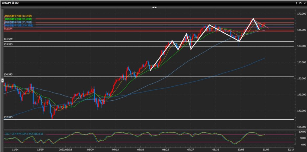 10月20日に最高値168.42円をつけた後下落した後、次の波では安値切上げ高値切下げ。