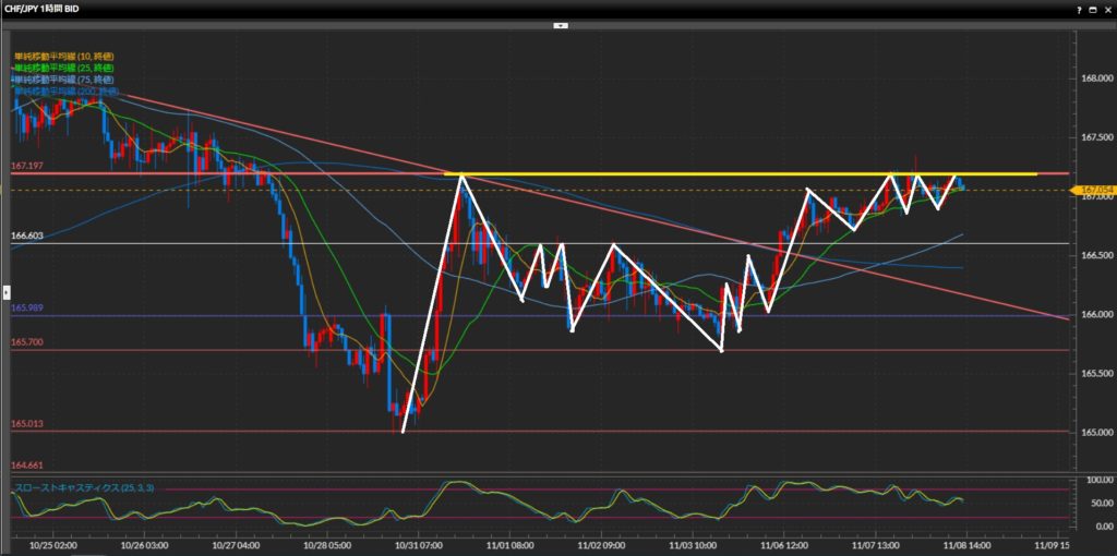 上位足で目線固定が出来ていないため、方向感に自信が持てるまでは様子見。 - フラン円は日足は上目線、4時間足は保留、1時間足は上目線。