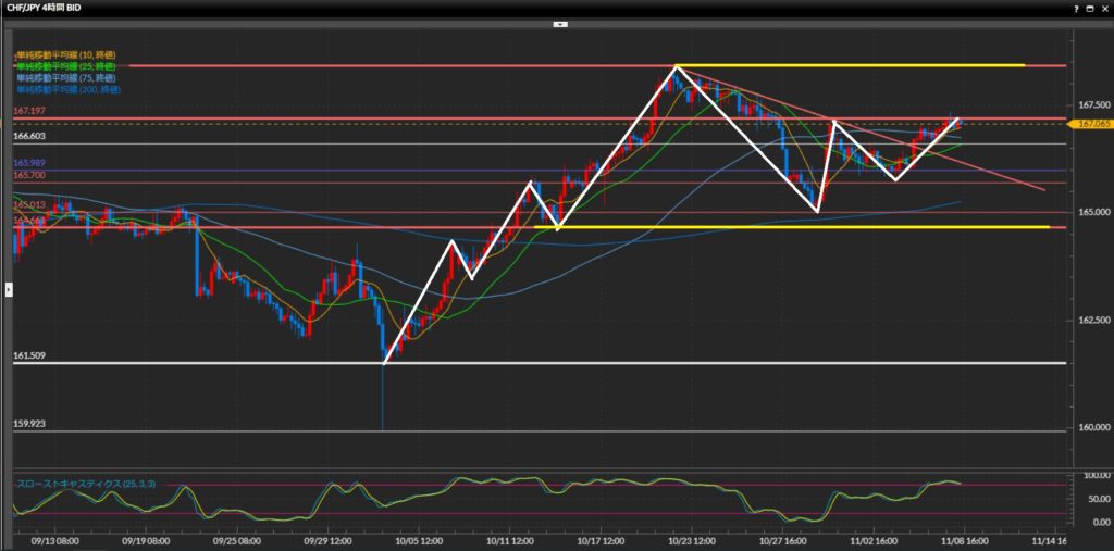 総合すると上寄りだが、4時間足水平線167.20円の壁が厚く停滞中。