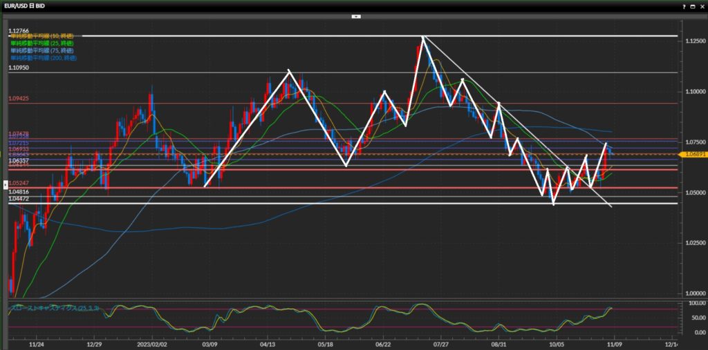 逆に白色の波が下目線に転換したら、上昇の起点107.50円までを目標にショート。