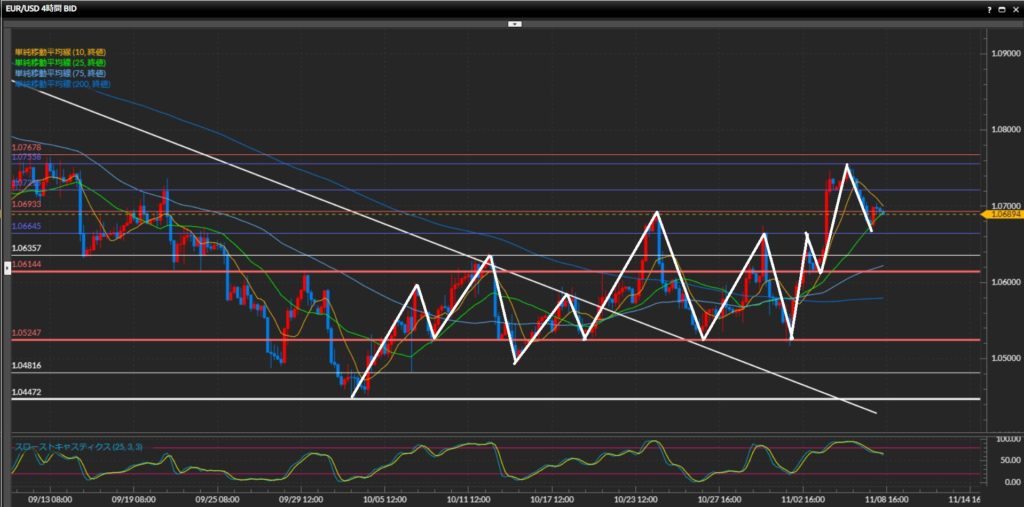 4時間足水平線1.0693ドルは機能しなかったものの、緑色の波のフィボナッチ38.2%(1.0665ドル)で一旦安値を形成。