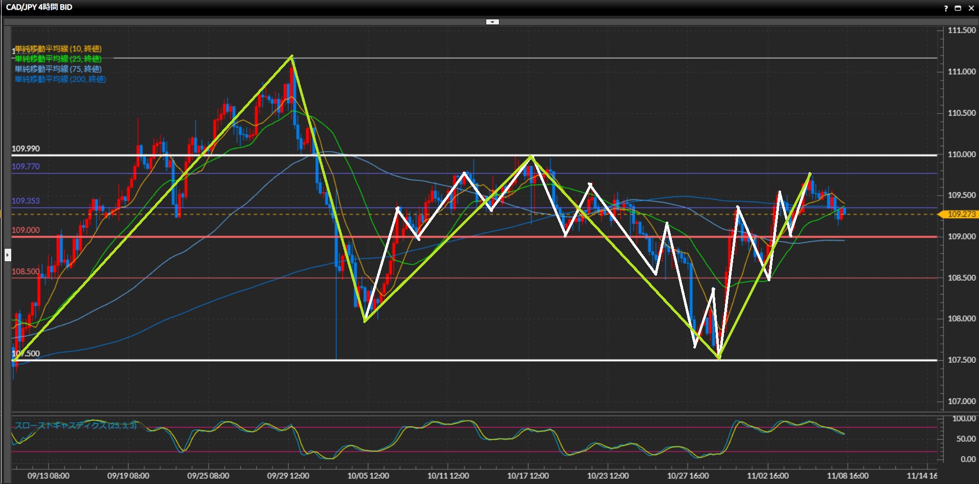 ただし大きな波の安値109.00円まで利幅が狭いため、今ショートは狙わない。