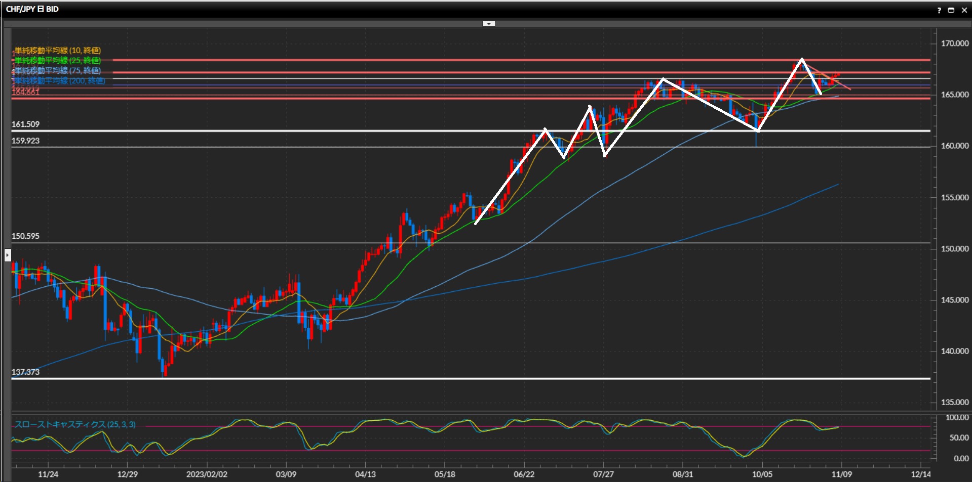 上位足で目線固定が出来ていないため、方向感に自信が持てるまでは様子見。 - フラン円は日足は上目線、4時間足は保留、1時間足は上目線。