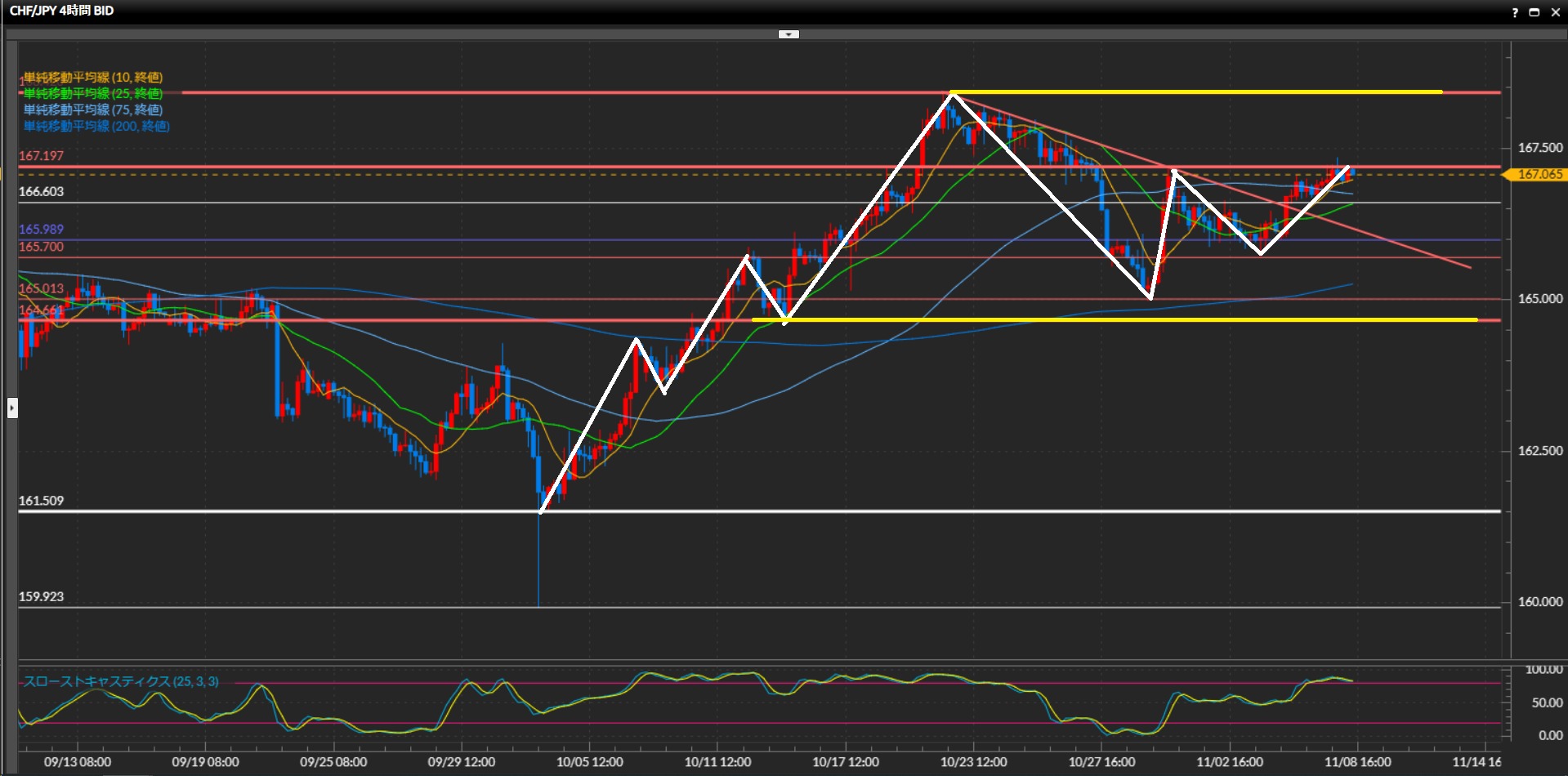 10月20日に最高値168.42円をつけた後下落した後、次の波では安値切上げ高値切下げ。