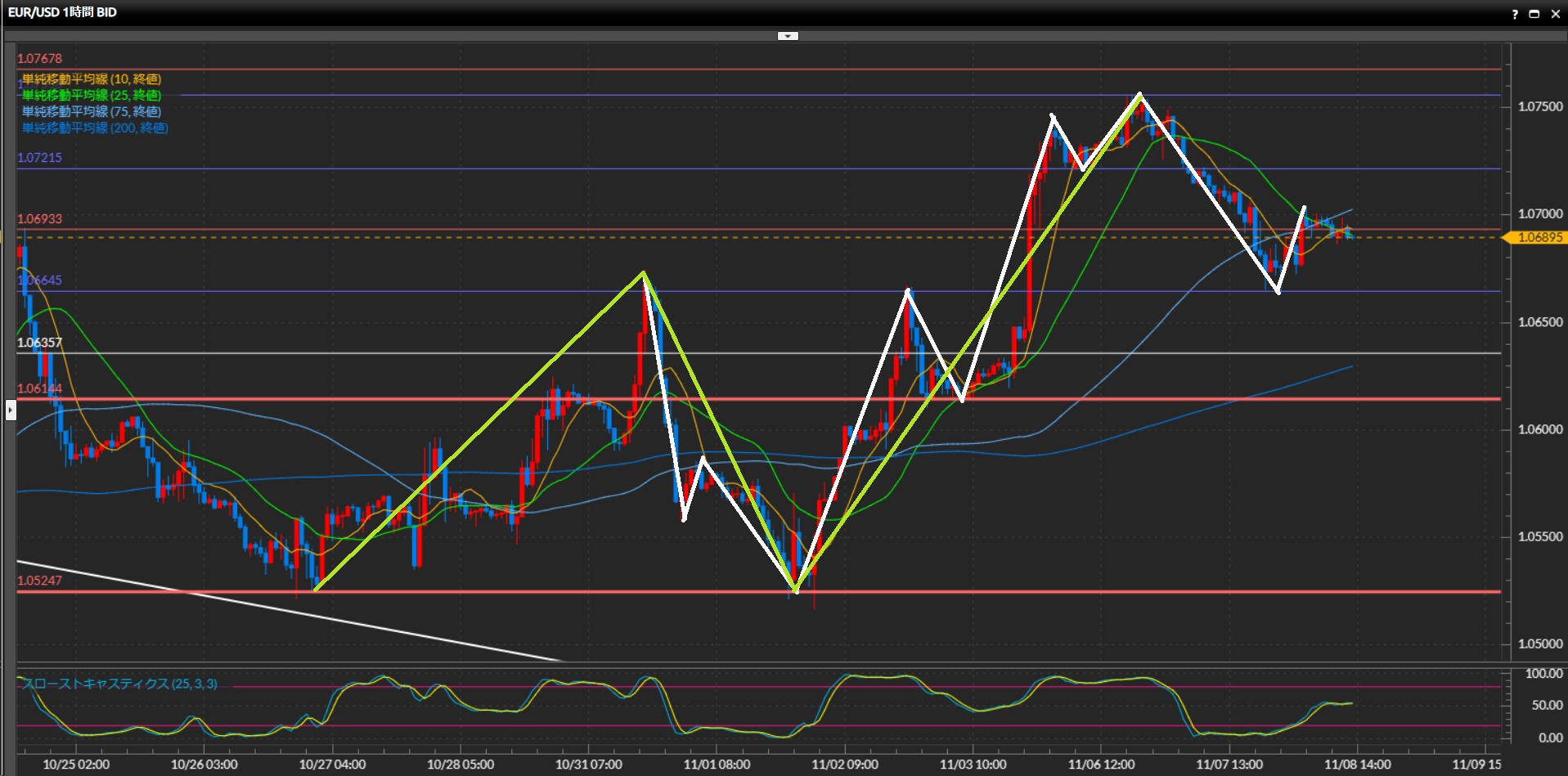 逆に白色の波が下目線に転換したら、上昇の起点107.50円までを目標にショート。