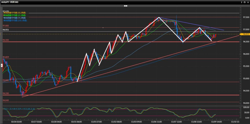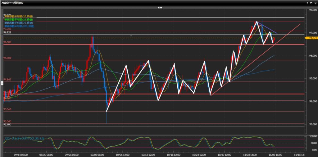 押し目からのロングが基本狙い。 - 豪ドル円は日足〜4時間足は上目線、1時間足は上目線終了。