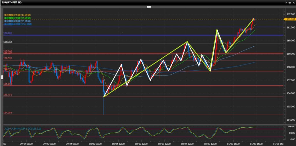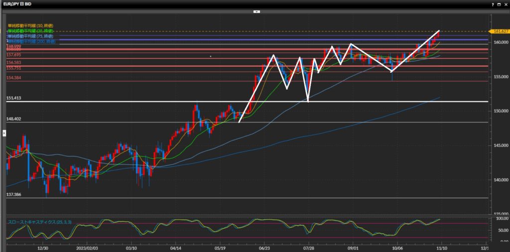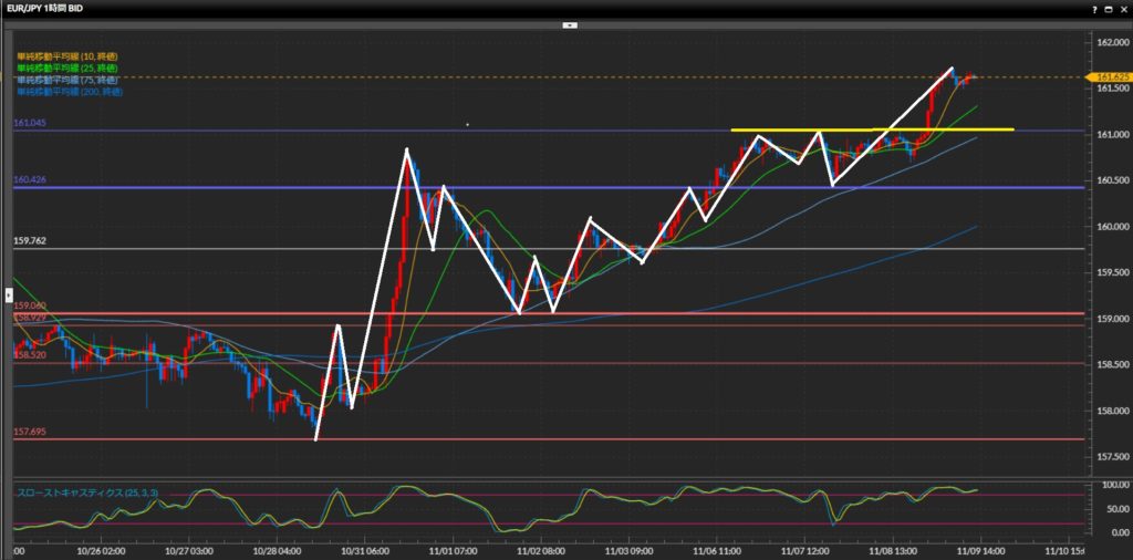 10月31日につけた最高値160.85円のライン上の揉み合いを突破。
