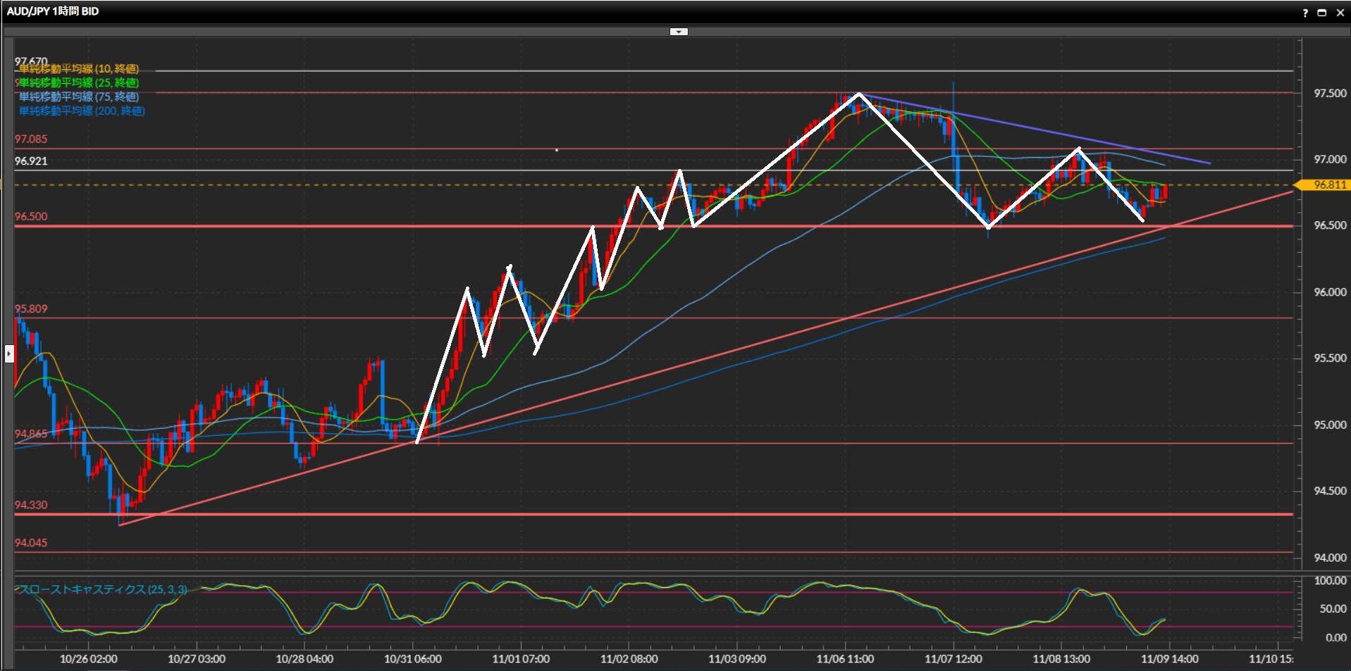 96.50円を下抜けたらショート、97.09円を上抜けたらロング。