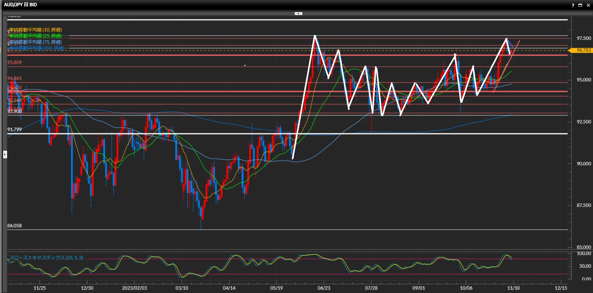 押し目からのロングが基本狙い。 - 豪ドル円は日足〜4時間足は上目線、1時間足は上目線終了。