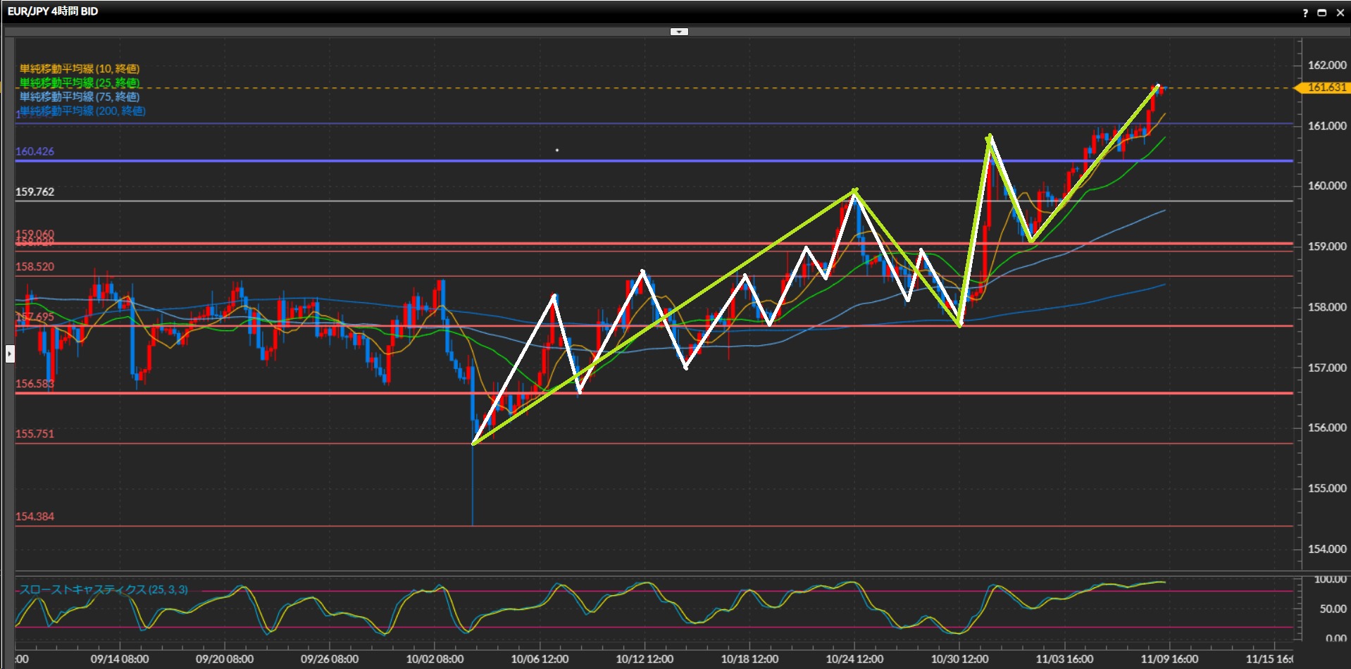水平線160.85円の揉み合いを上抜け、最高値更新中。