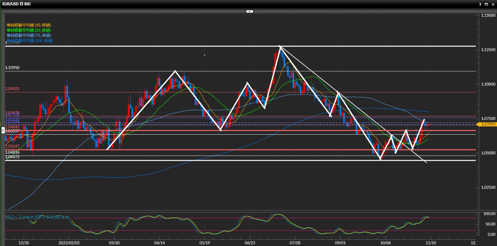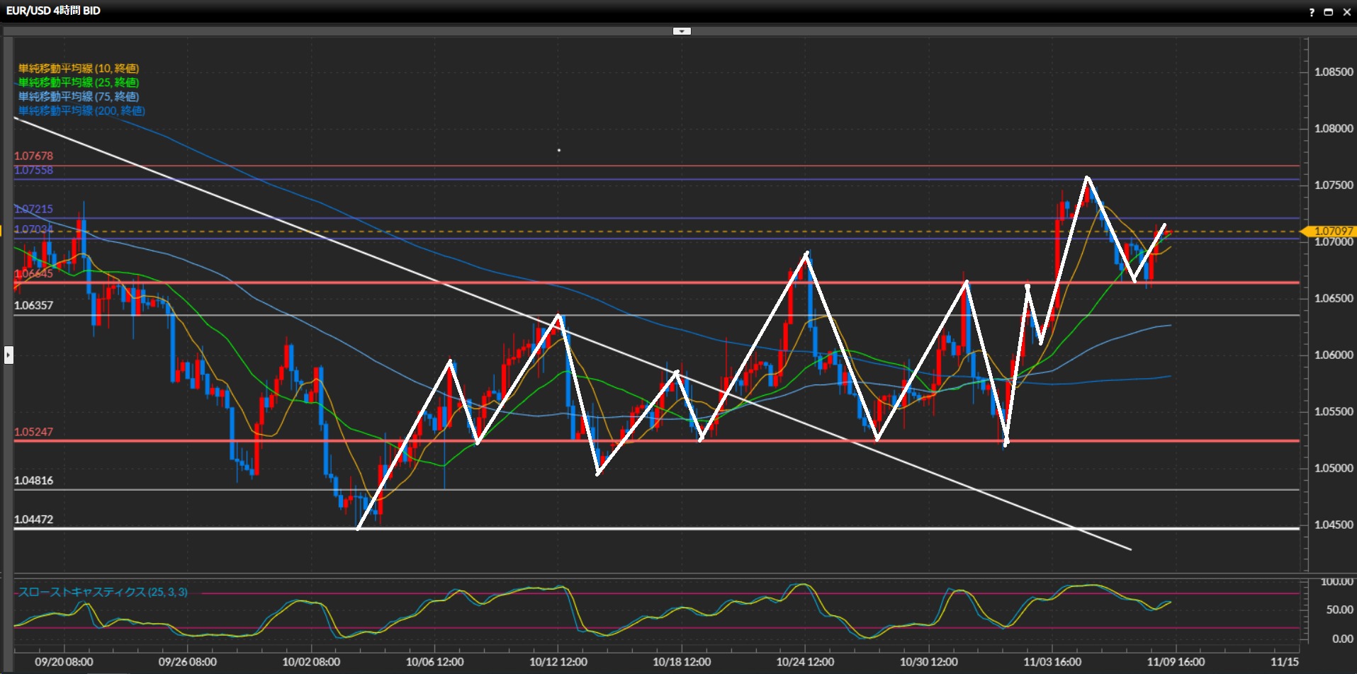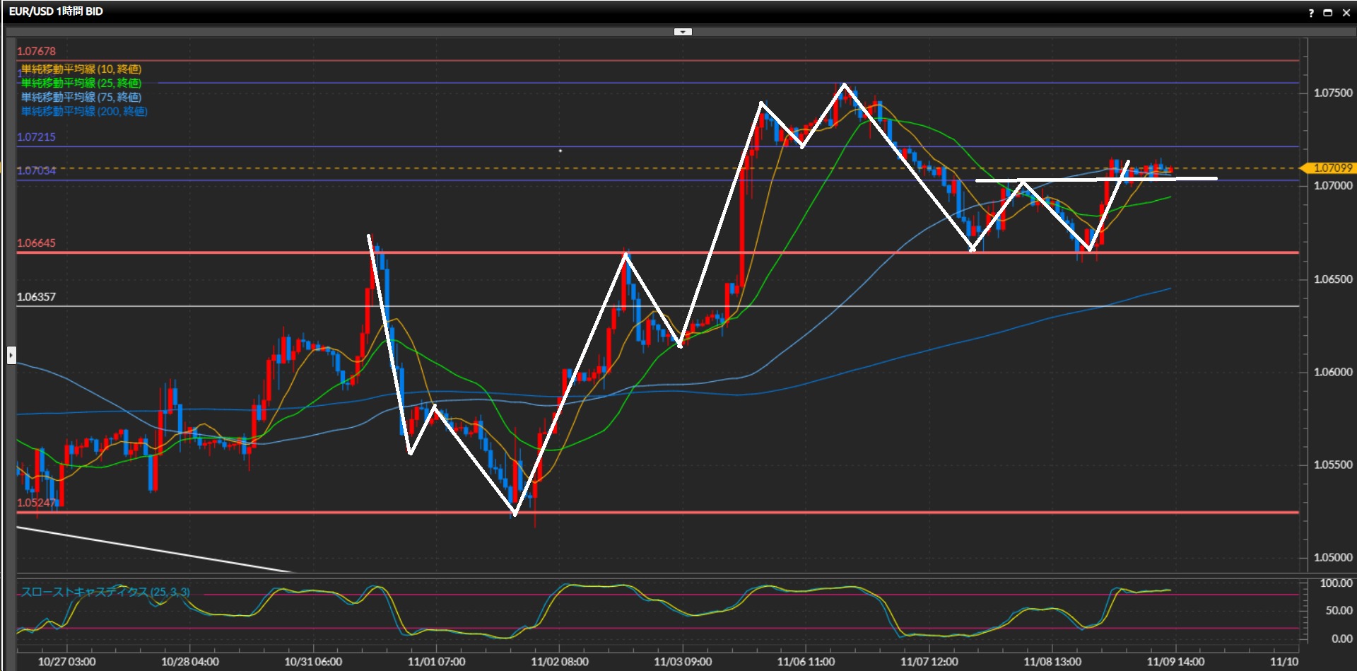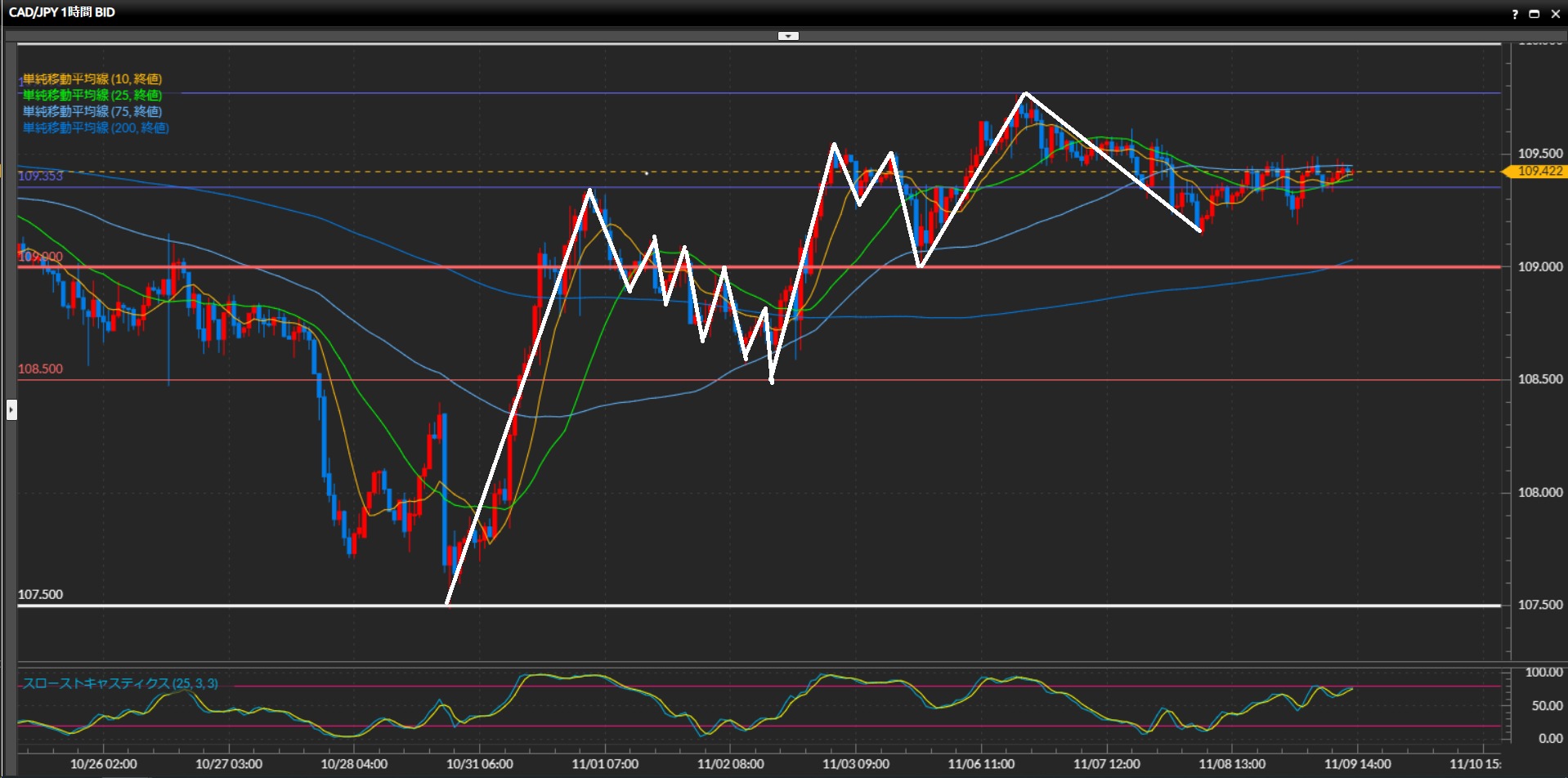 逆に白色の波が下目線に転換したら、上昇の起点107.50円までを目標にショート。