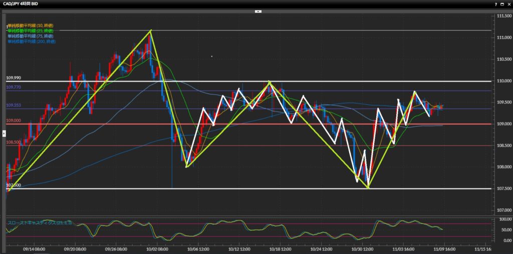 波の高値で引いた水平線109.99円でレジスタンスされたら、レンジへ突入。
