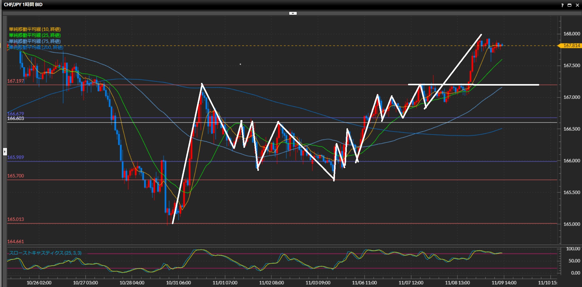 ここまで日足75SMAが上昇を抑えているため、ブレイクできるか勢いをよく確認。