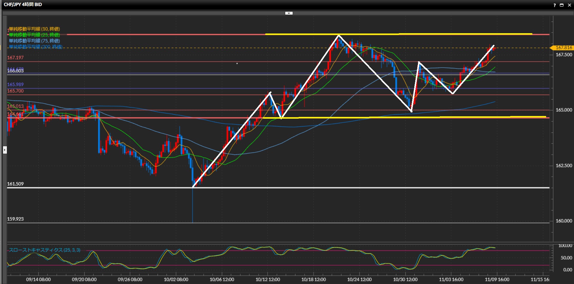 4時間足が上目線に固定されたため、最高値168.42円に注意しながら基本ロング。