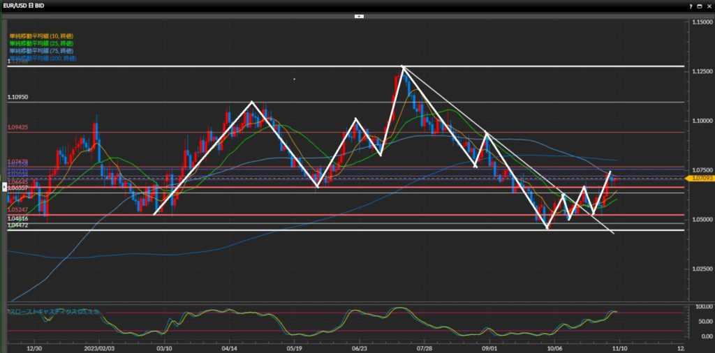 上値を押さえていた水平線1.0700円を上抜けたため、積極的にロングを狙っていく。