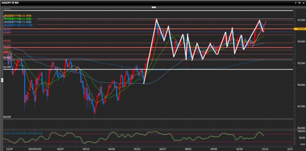 • 豪ドル円は日足は上目線、4時間足は下目線、1時間足は下目線終了。