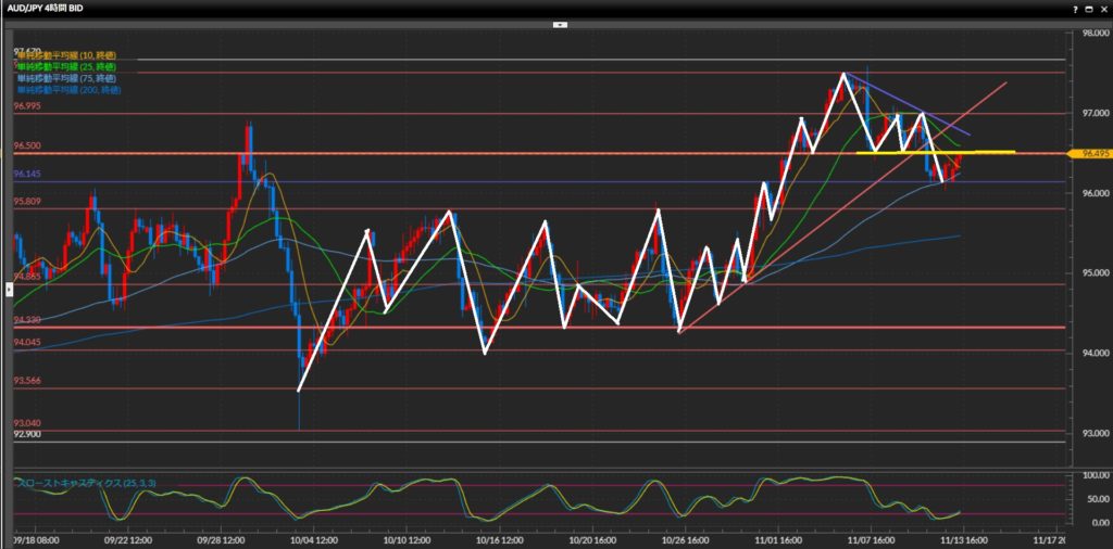 4時間足水平線96.50円の機能が弱い事から、上昇が再開するシナリオも想定したい。