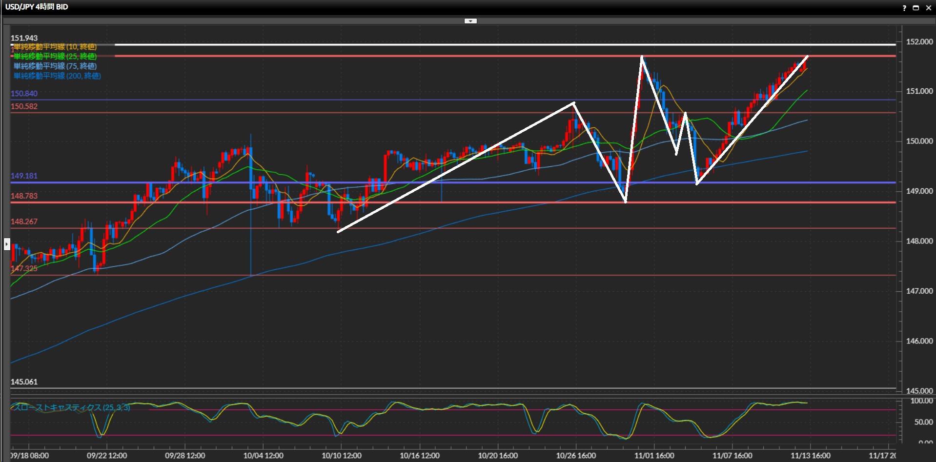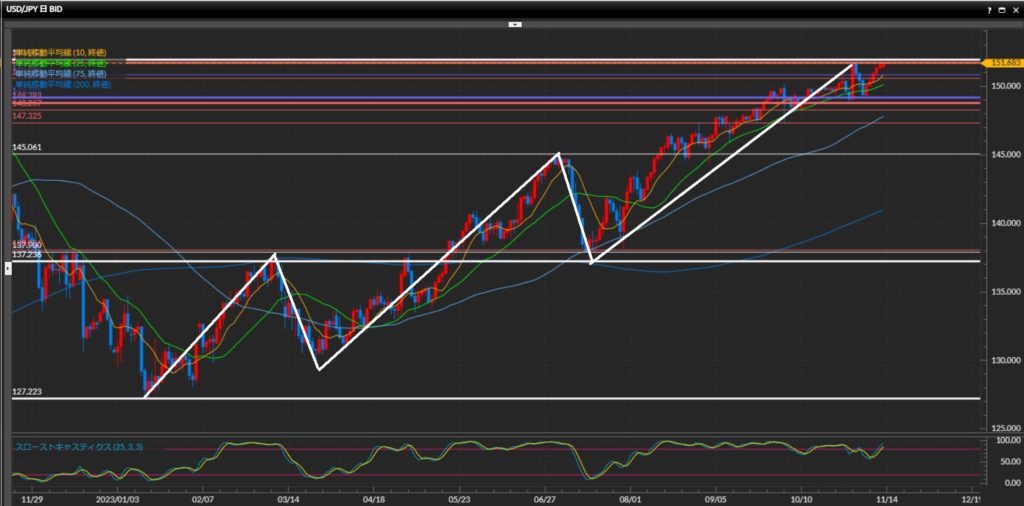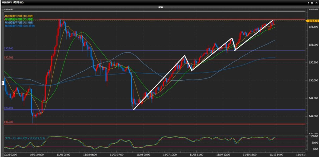 • ドル円日足〜1時間足で上目線。10月31日の高値151.72円に迫っている。