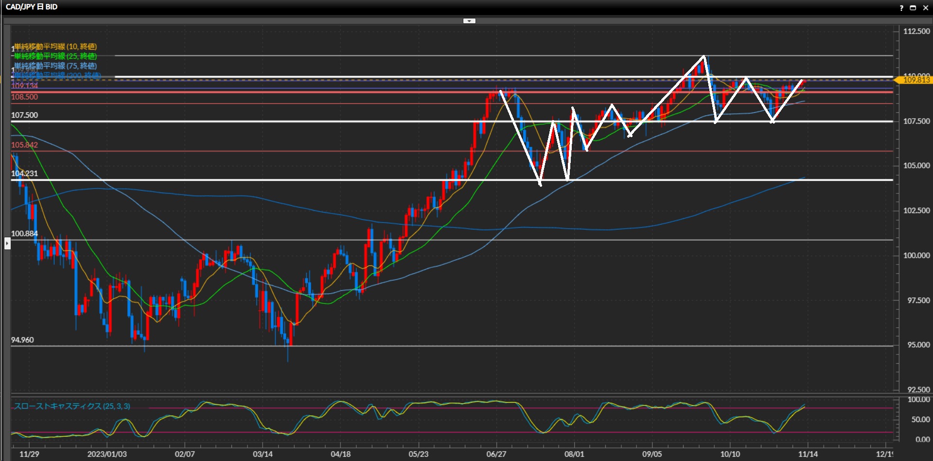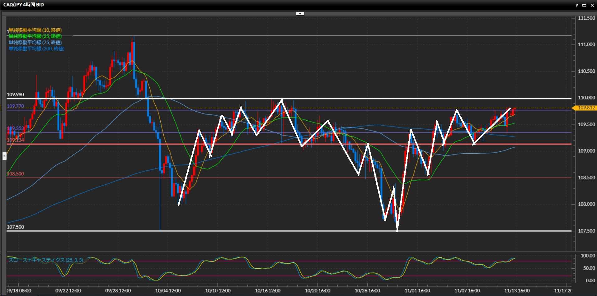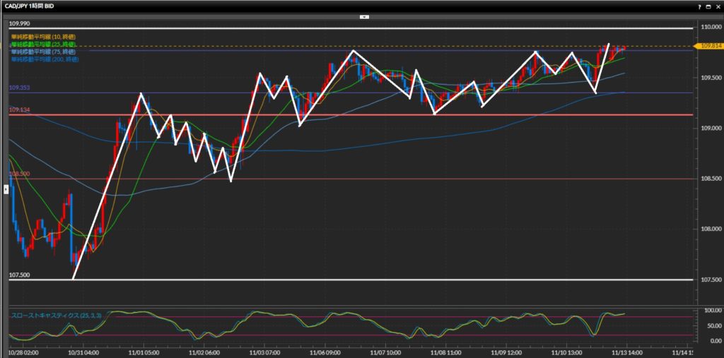 続いて日足水平線109.99円を抜けられるか注目。