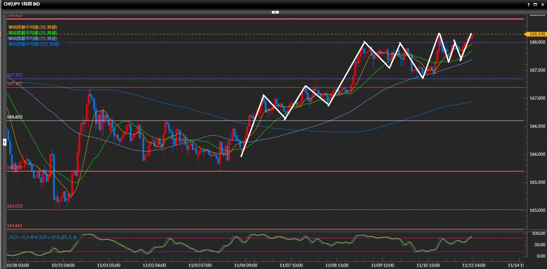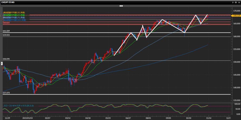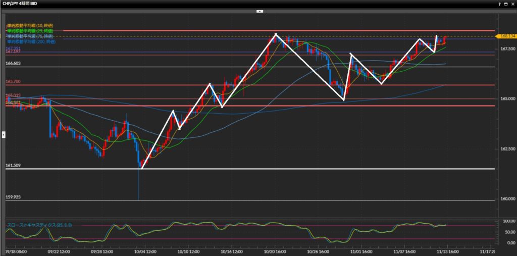 10月20日につけた最高値168.42円に迫っており、どの時間足で見ても上昇が強い。