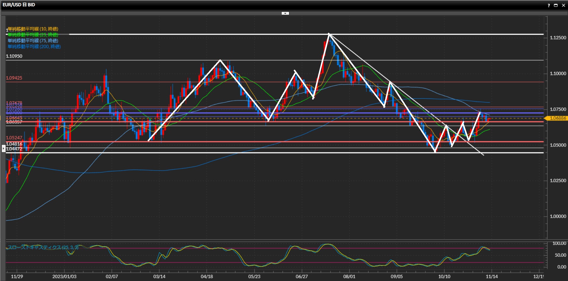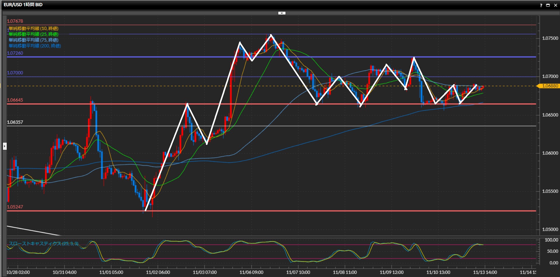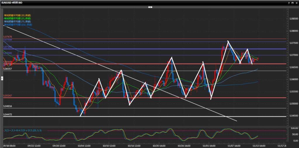 小さな波で高値を切り下げているものの下値は1.0665ドルがサポートしている。