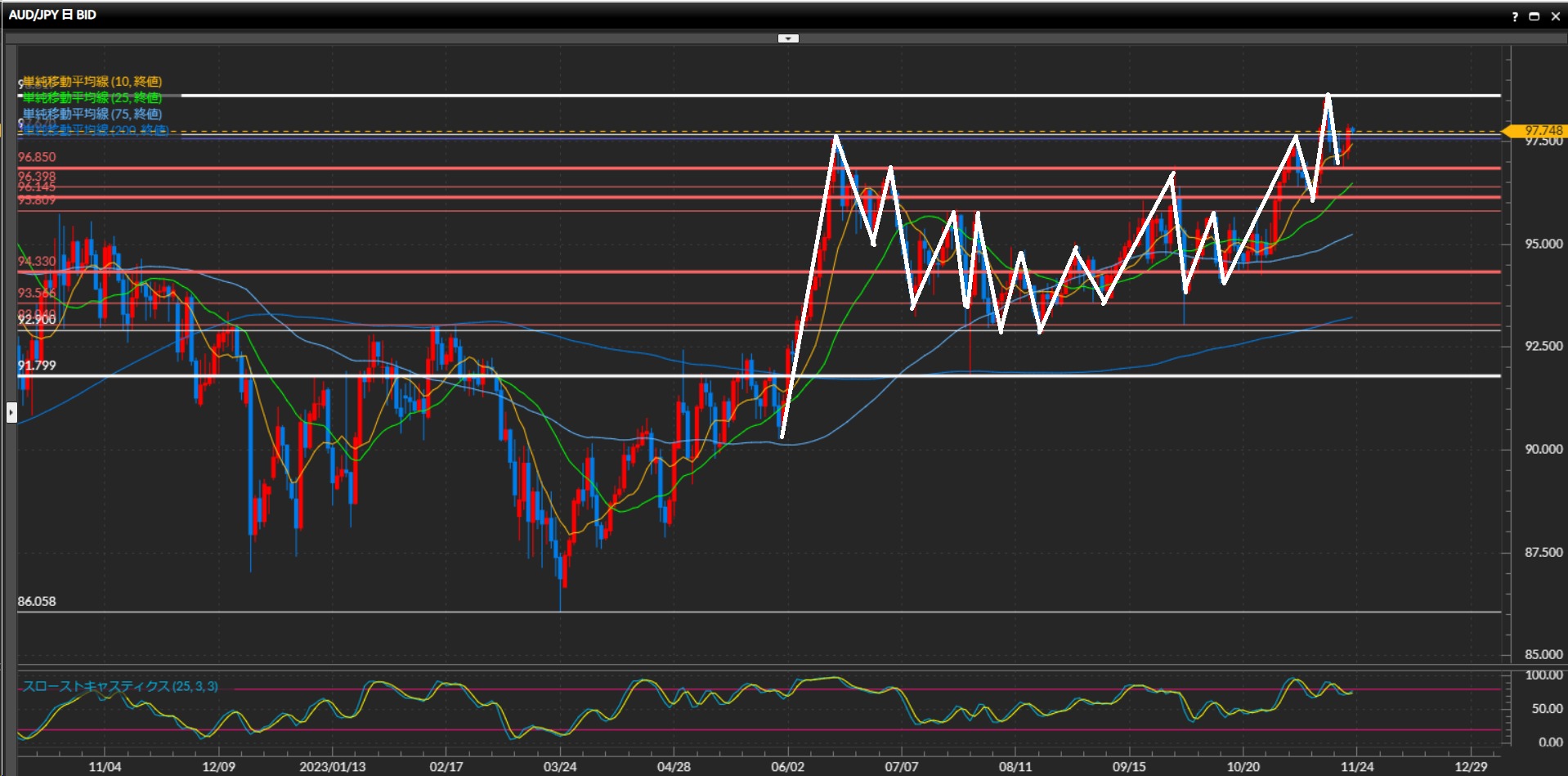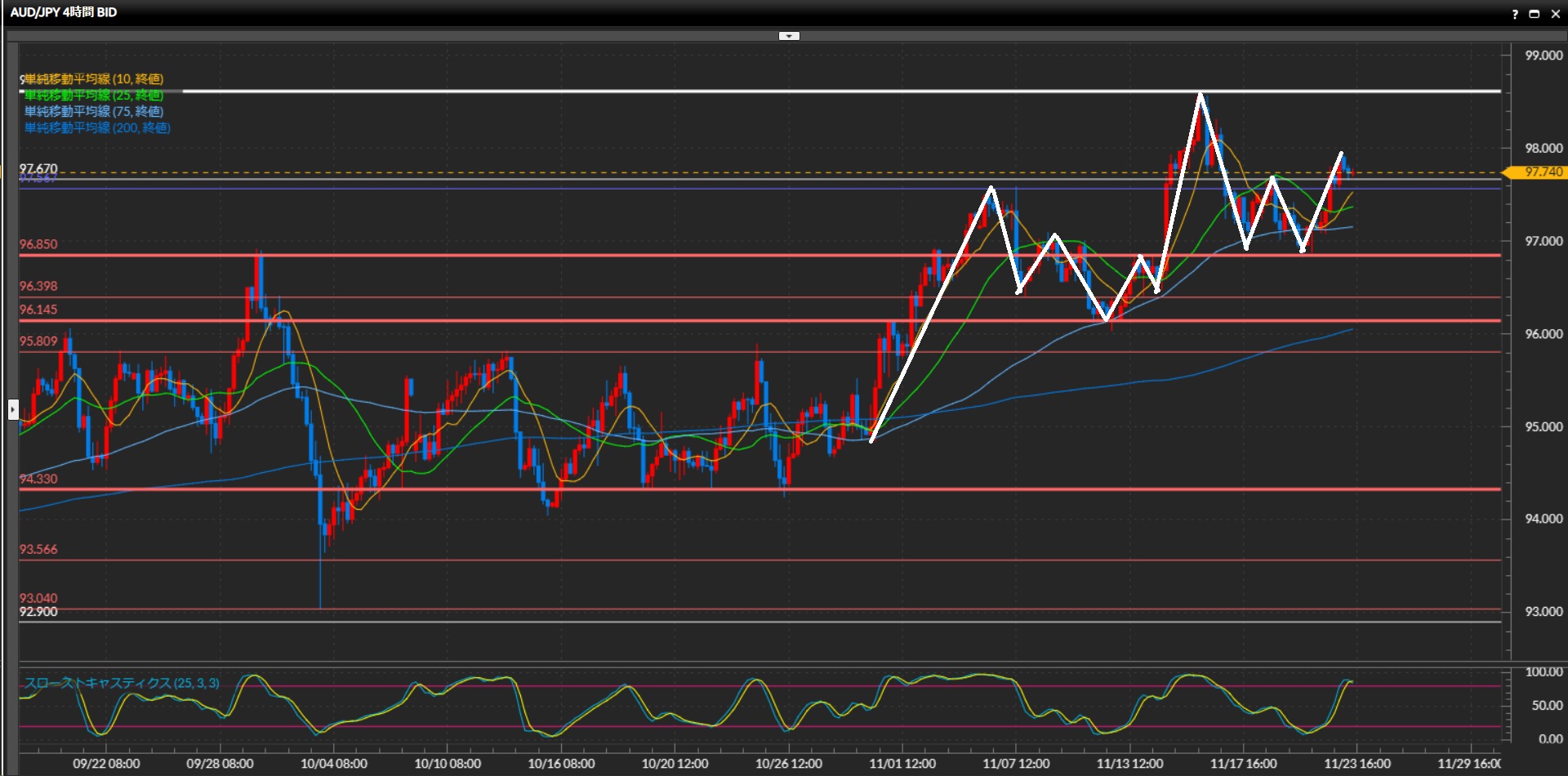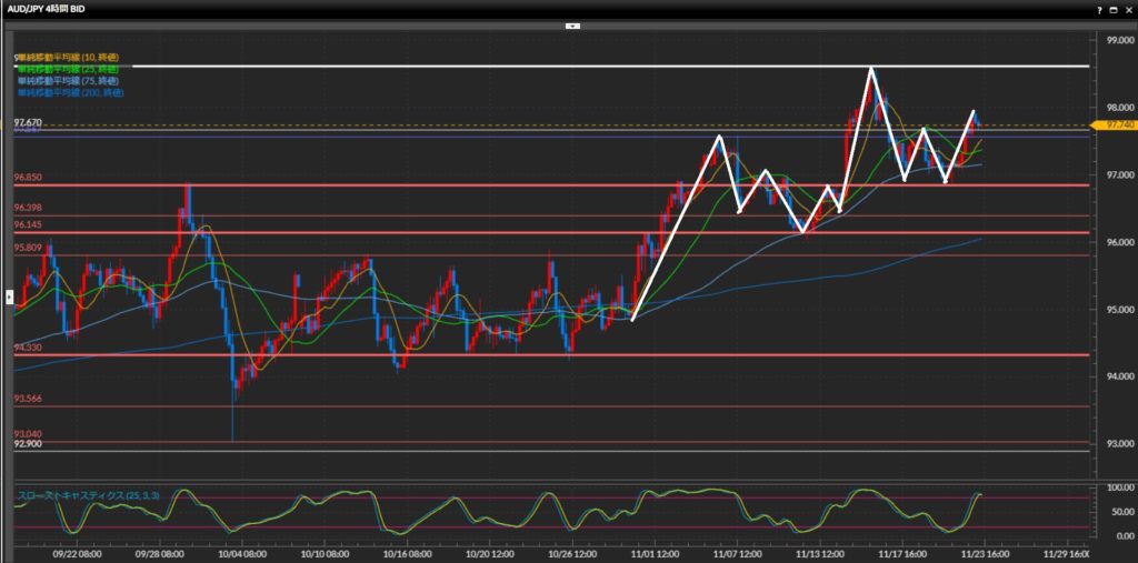 ローソクが25SMAを若干下抜けており、停滞しかけている点に注意。