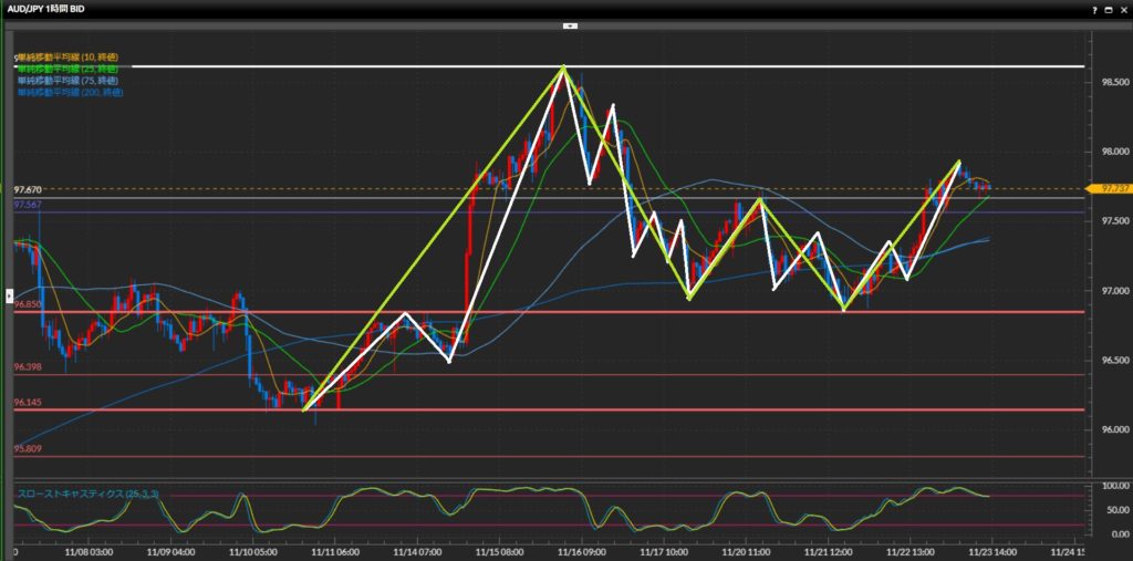 日足水平線、かつ4時間足の目線転換線97.67円のレジサポ転換したらロング狙い。