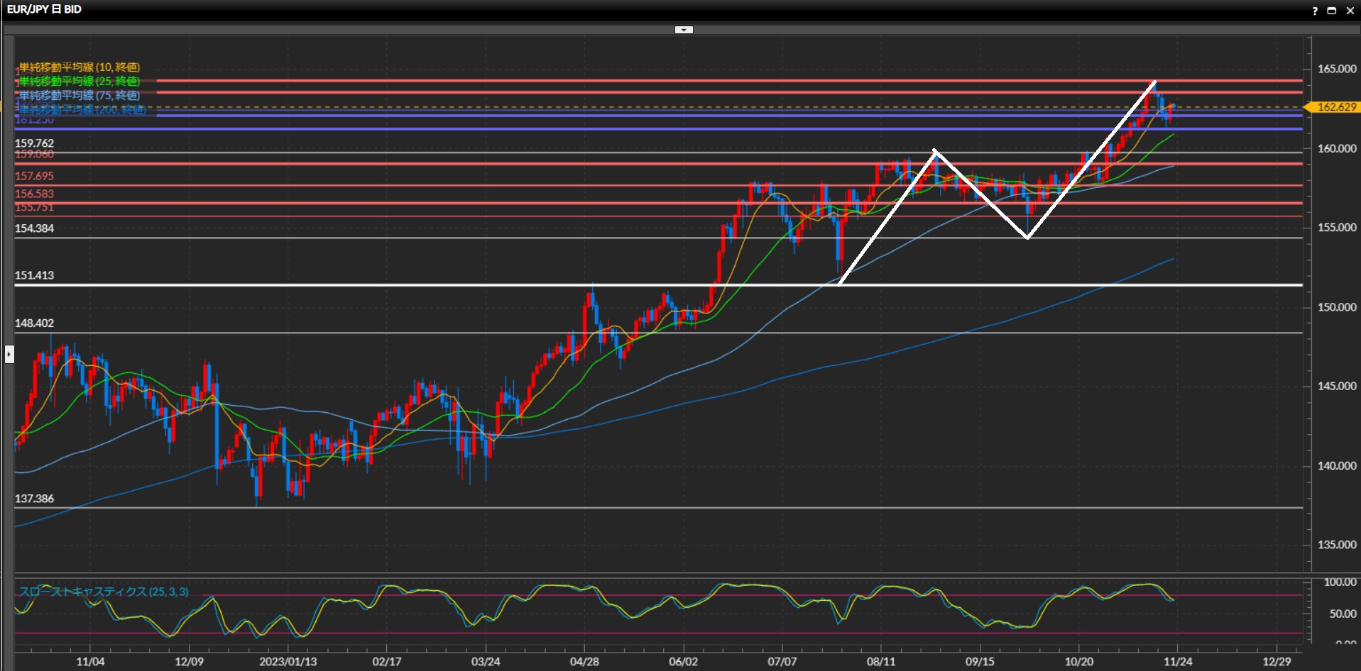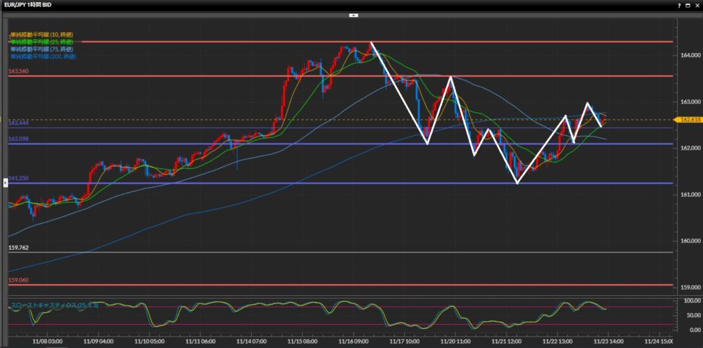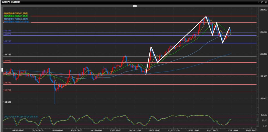 下落に対して半値以上戻しているため、基本は1時間足基準でロング狙い。 - ユーロ円は日足は上目線、4時間足は下目線、1時間足は上目線。