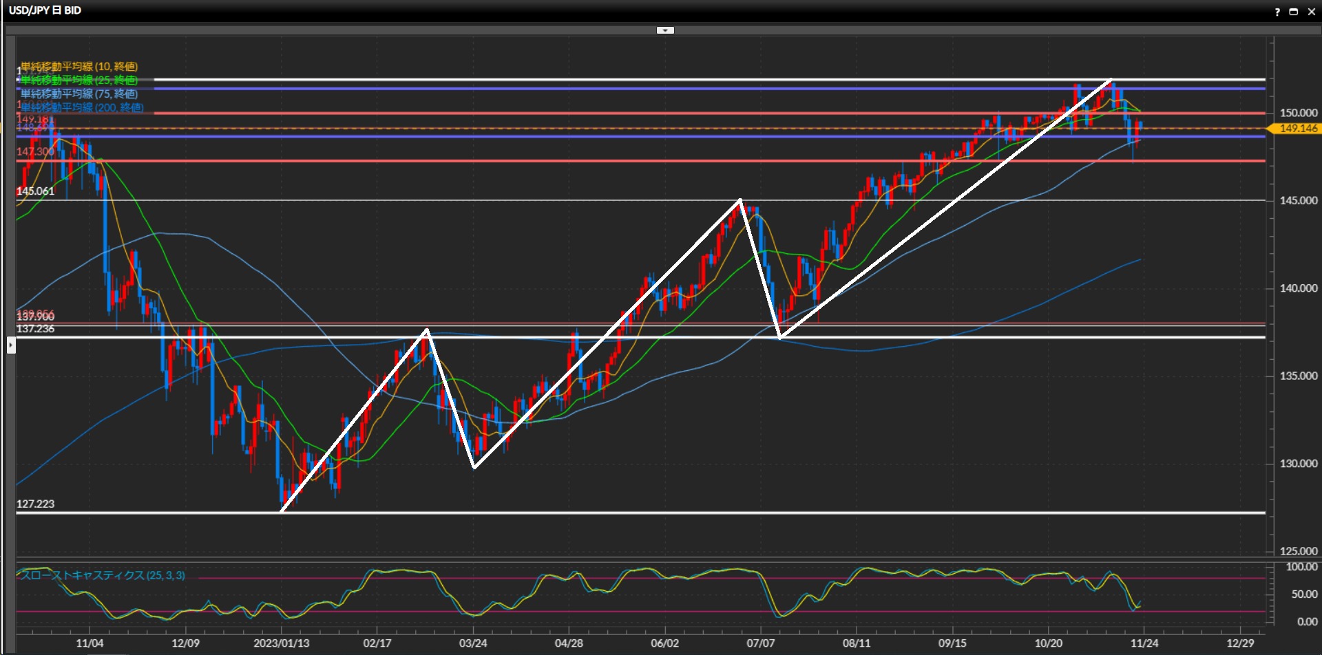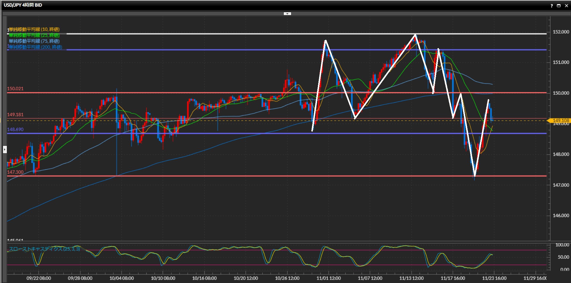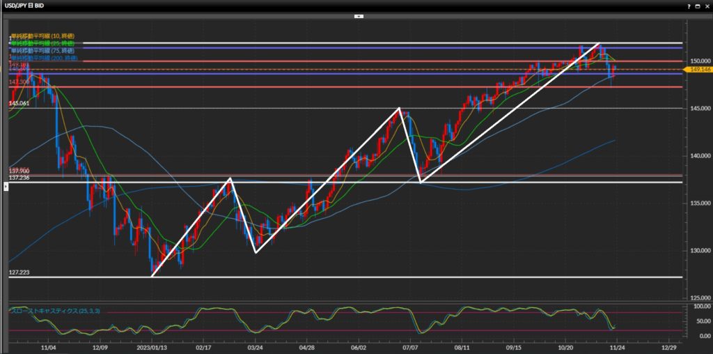 - ドル円は日足は上目線、4時間足は下目線、1時間足は上目線。