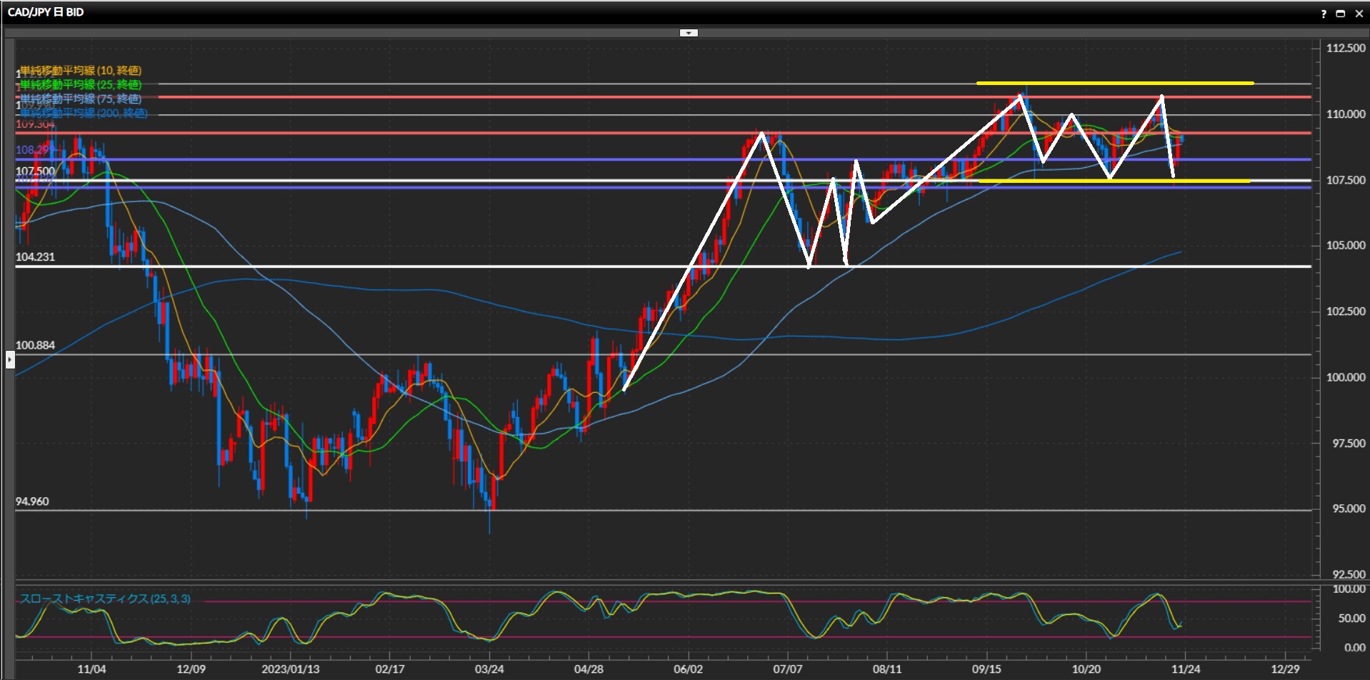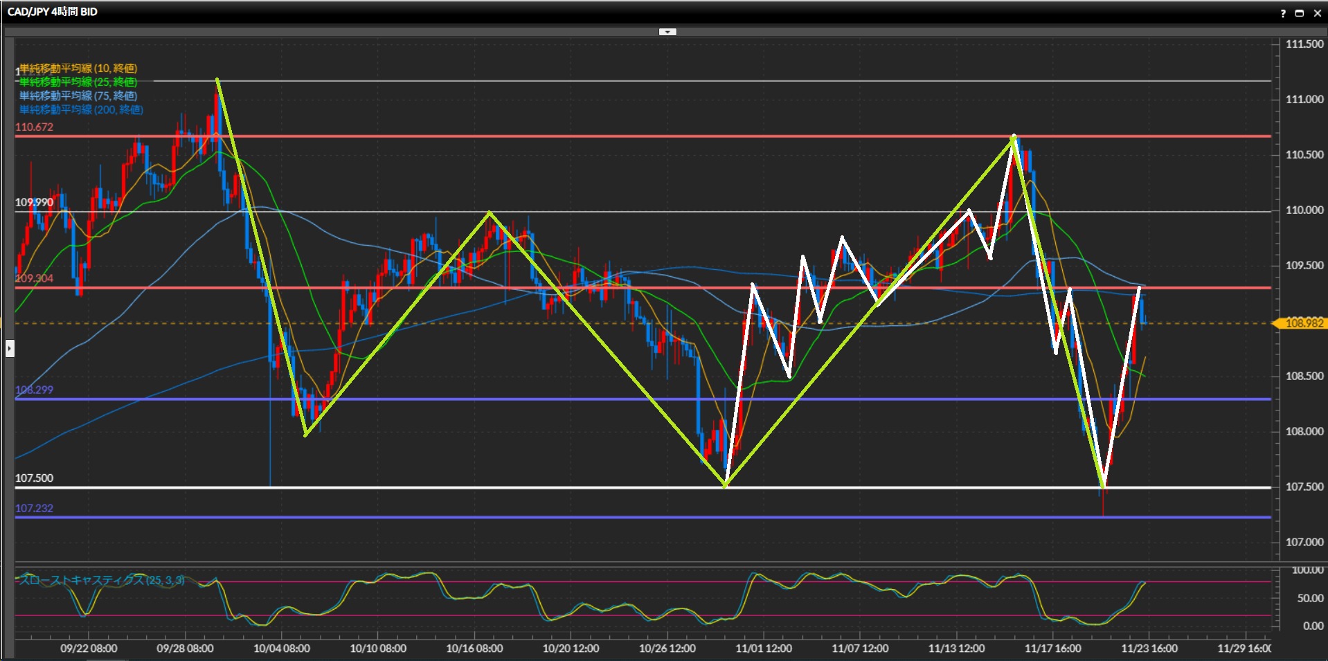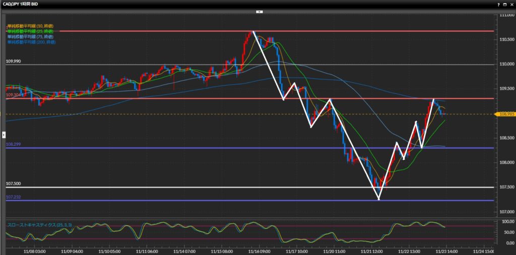 - 加ドル円は日足はレンジ、4時間足は下目線、1時間足は上目線。
