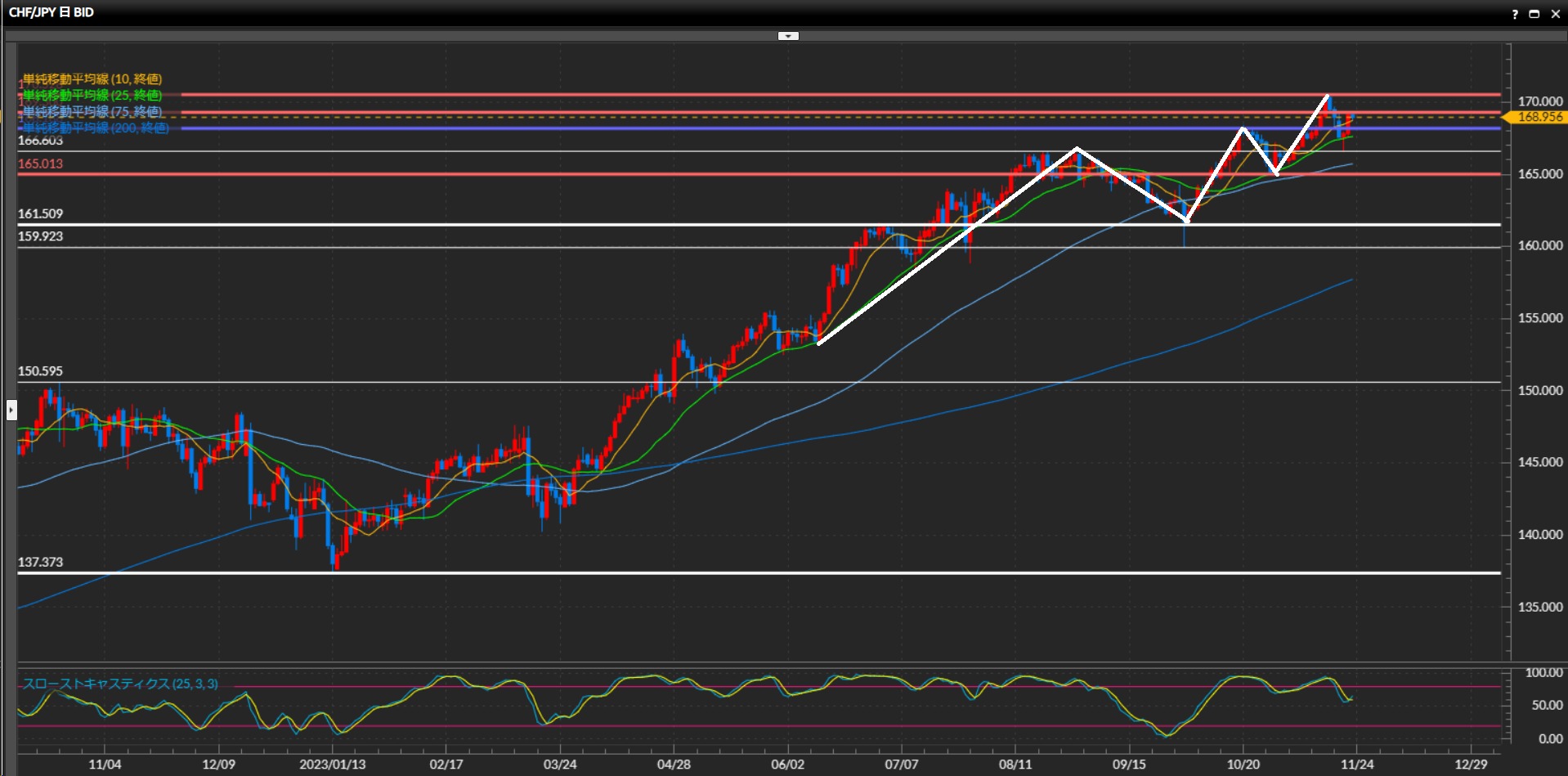 4時間足の目線転換線にぶつかって停滞中のため、ブレイクしてからロング狙い。 - フラン円は日足は上目線、4時間足は下目線、1時間足は上目線。