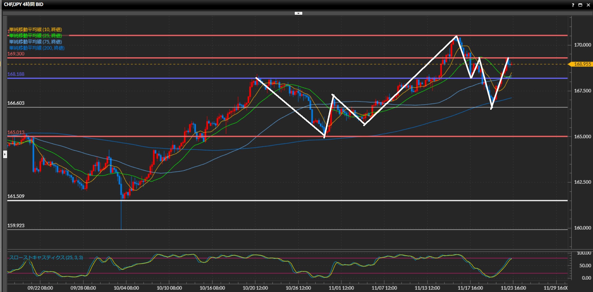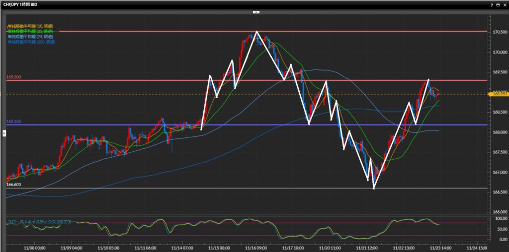 直近の安値は168.19円で、切り下げない限りは上目線。