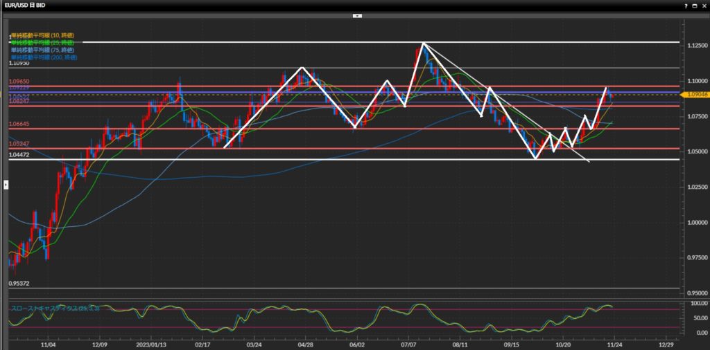 上抜け確定したらロングを狙う。 - ユーロドルは日足〜1時間足で上目線。