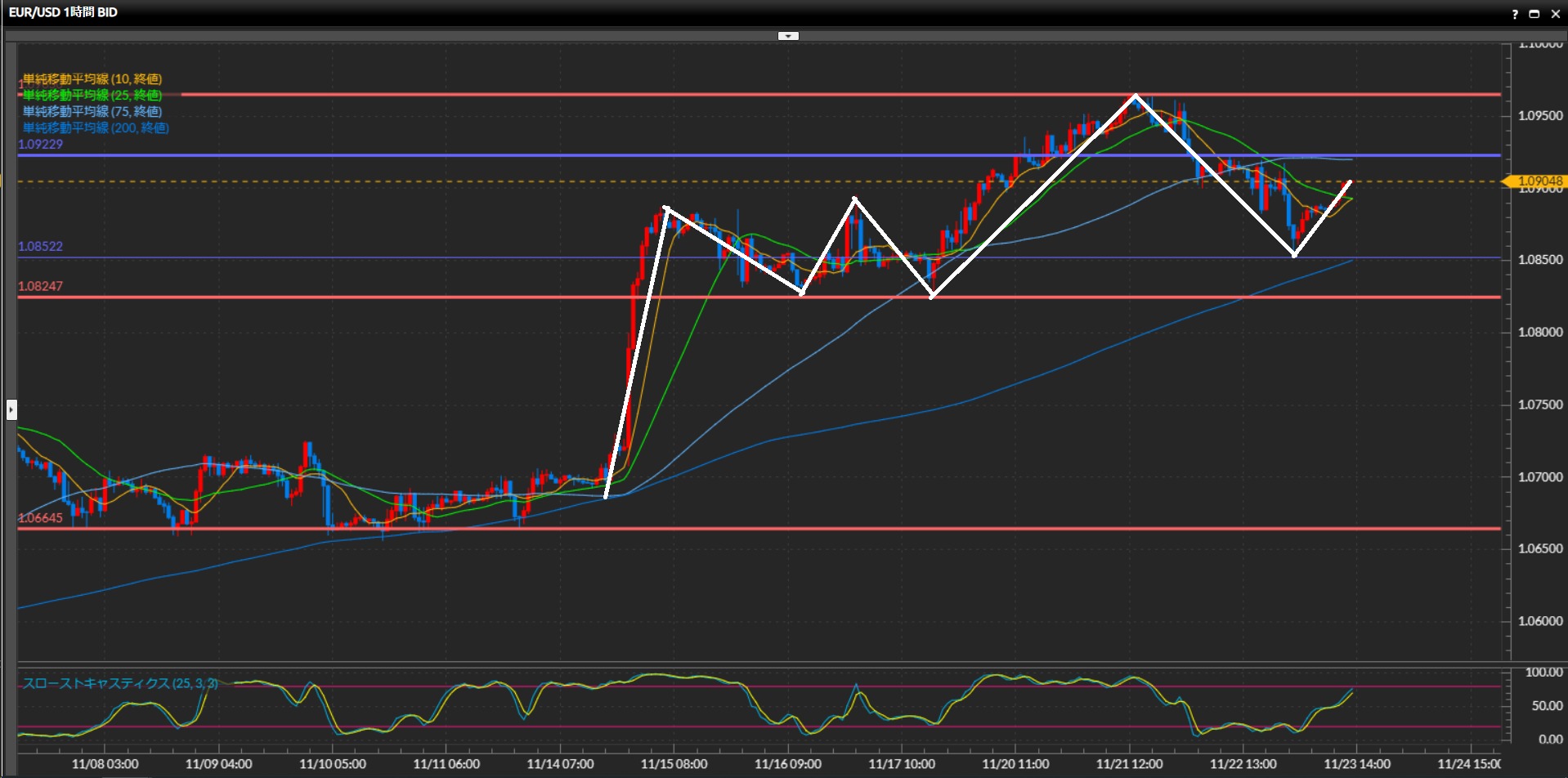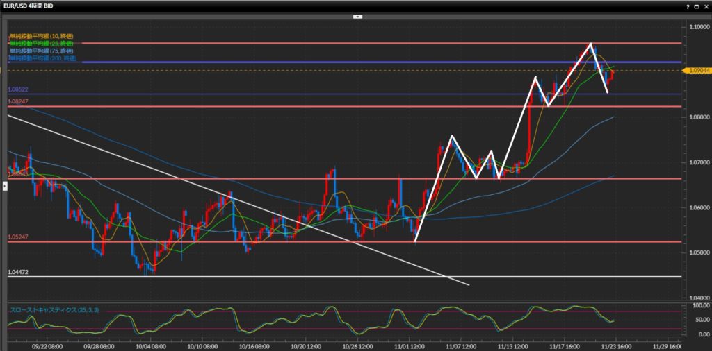 その下には4時間足水平線1.0887ドルが通っており、サポートされるか注目。