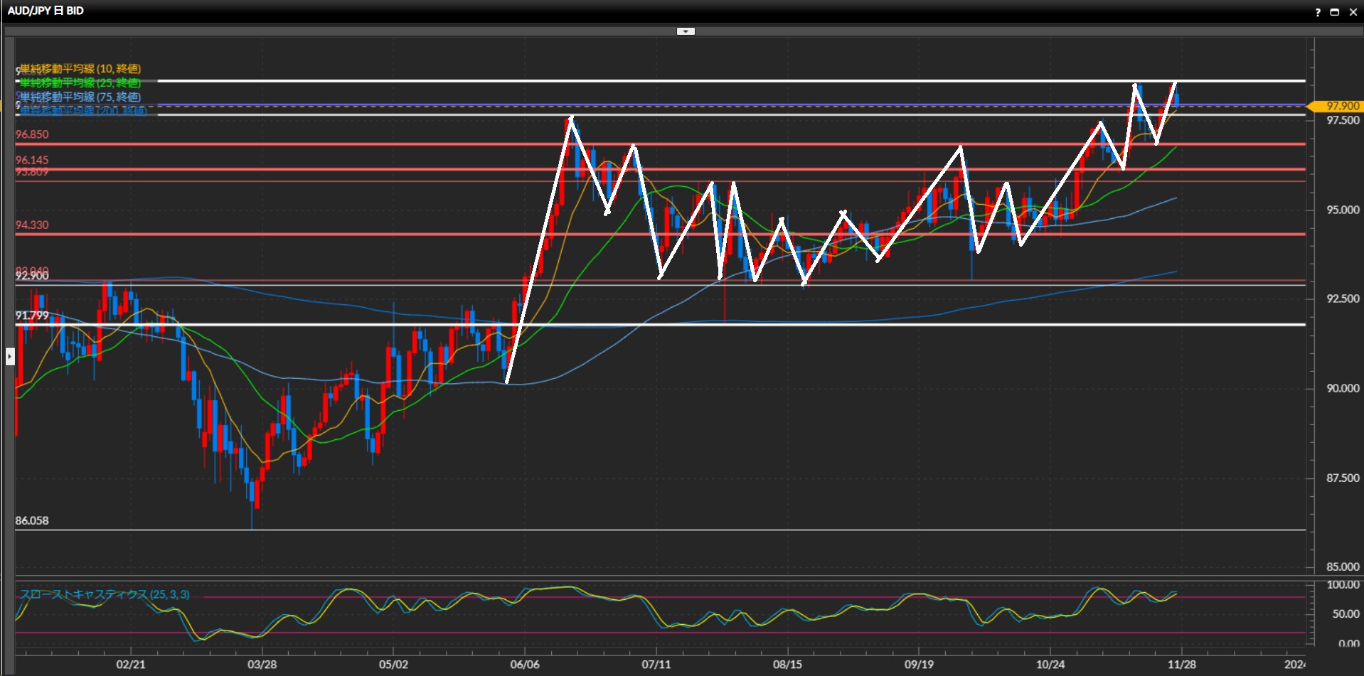 • 豪ドル円日足は上目線、4時間足は下目線終了、1時間足は上目線終了。