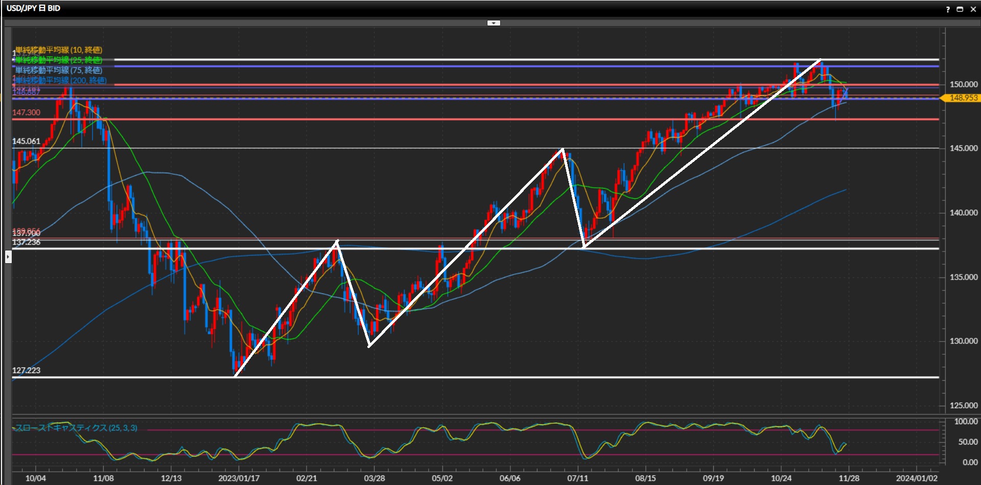 安値148.89をつけた事により下目線が終了。