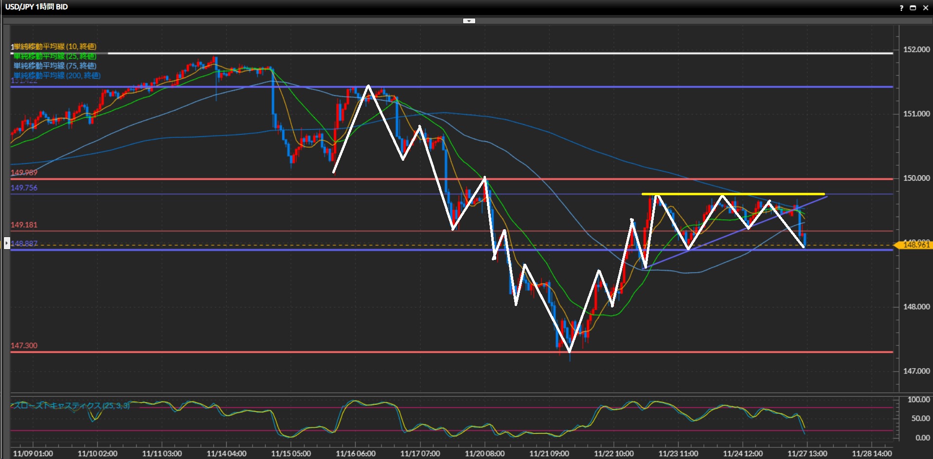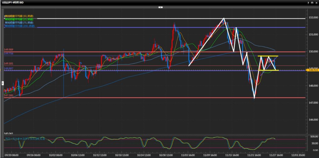 148.89円-149.76円の間で揉み合い中。