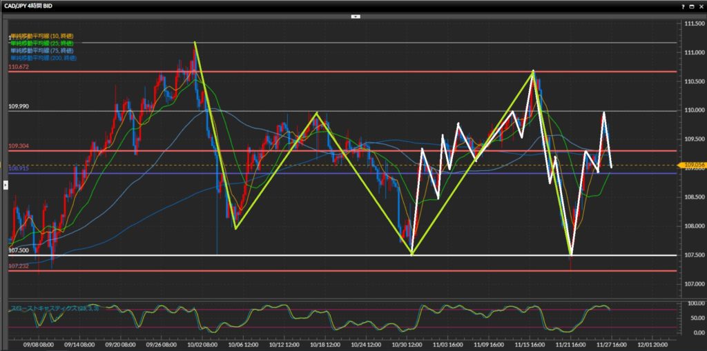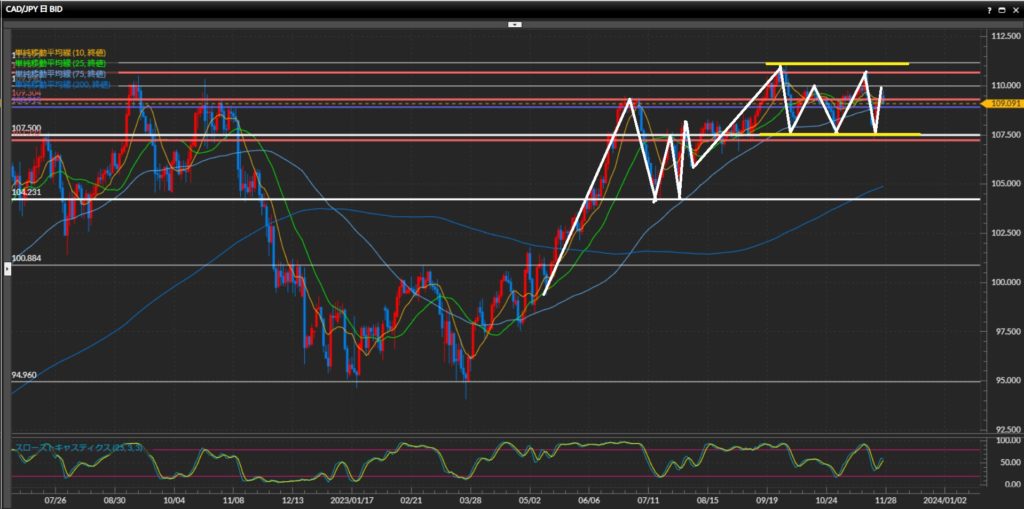- 加ドル円は日足はレンジ、4時間足〜1時間足は上目線。