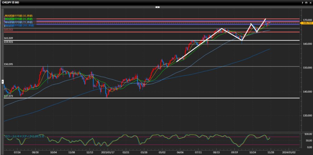 1時間足では直近安値付近まで下落しており、切り下げたら上狙いは終了。 - フラン円は日足は上目線、4時間足は下目線終了、1時間足はツツミ。