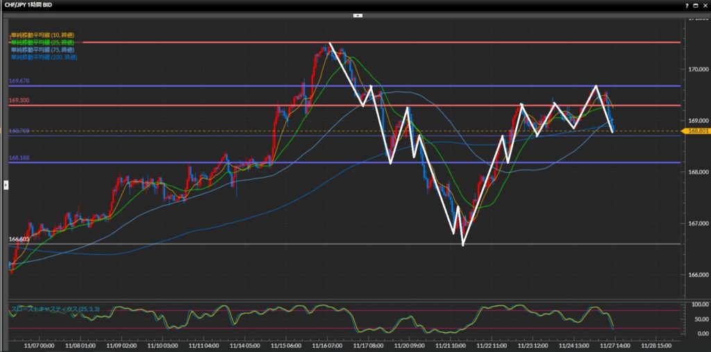 4時間足水平線169.30円があまり機能していない事や、1時間足の高値切上げ安値切下げの形を作った事に注意したい。