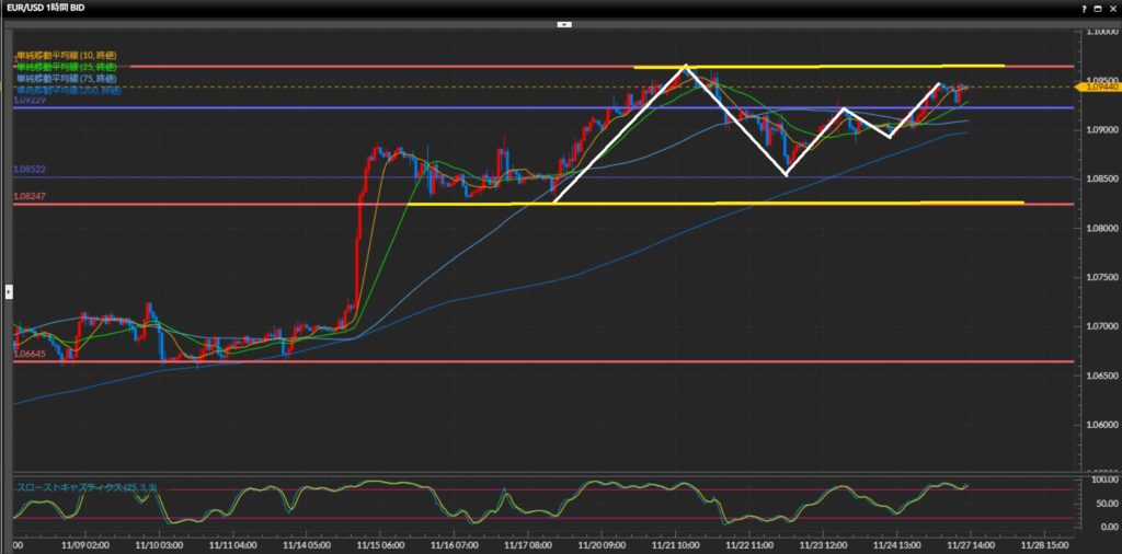 1.0825ドル-1.0965ドルの間の上下と捉え、小さな波で高値安値を切り上げている。